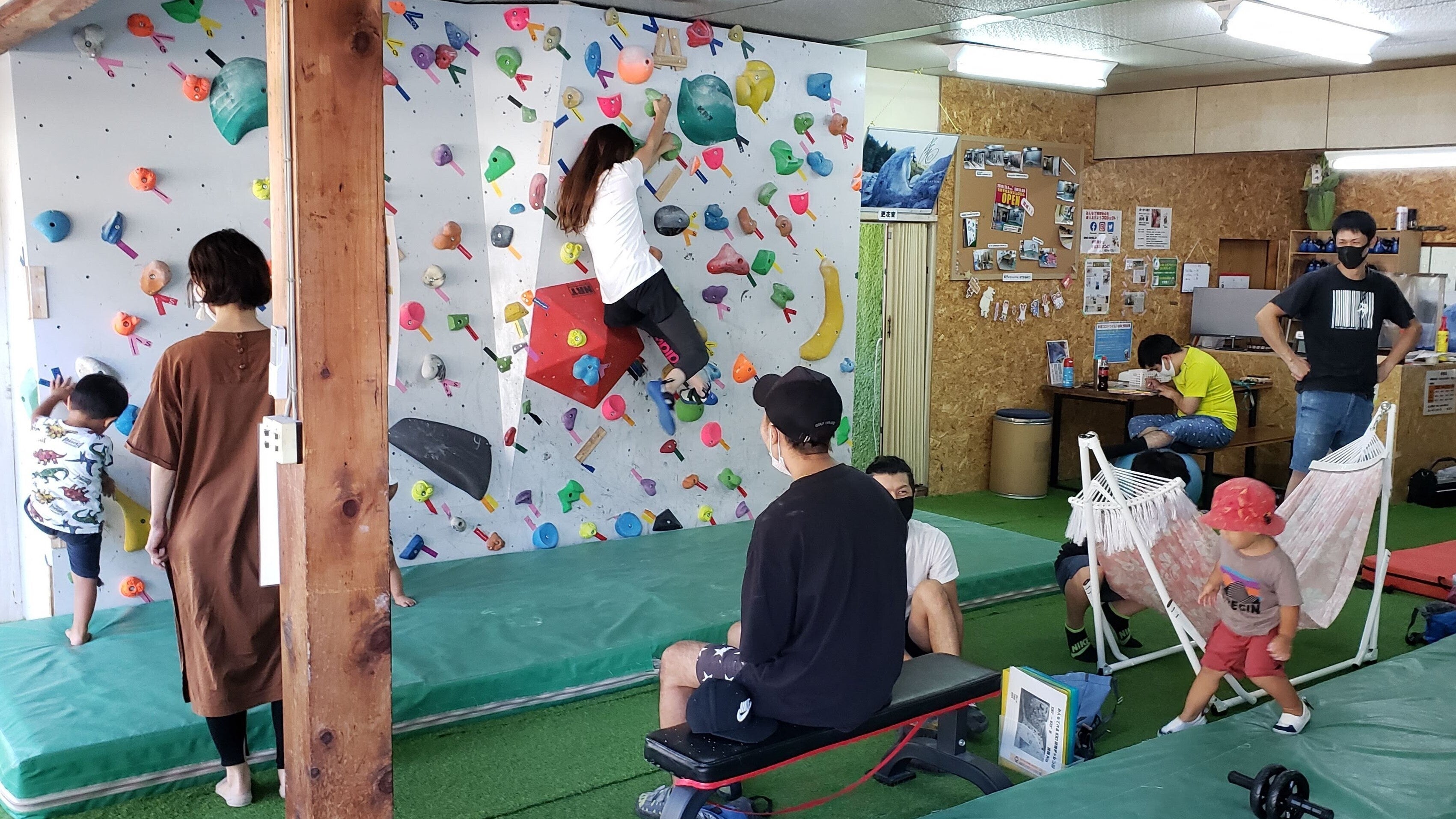 天井が2.7mと一般的なボルダリングジムよりも低く安全性が高いことが幸いし、最年少は0歳9か月、最高齢はなんと95歳まで!老若男女世代を超えた地元の方々の交流の場になりました。