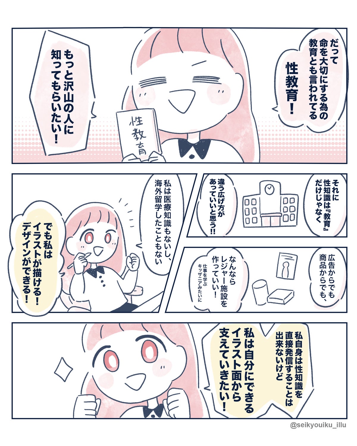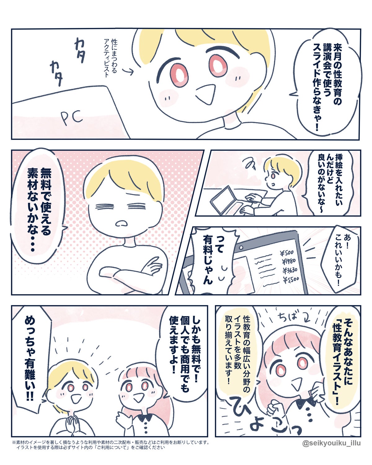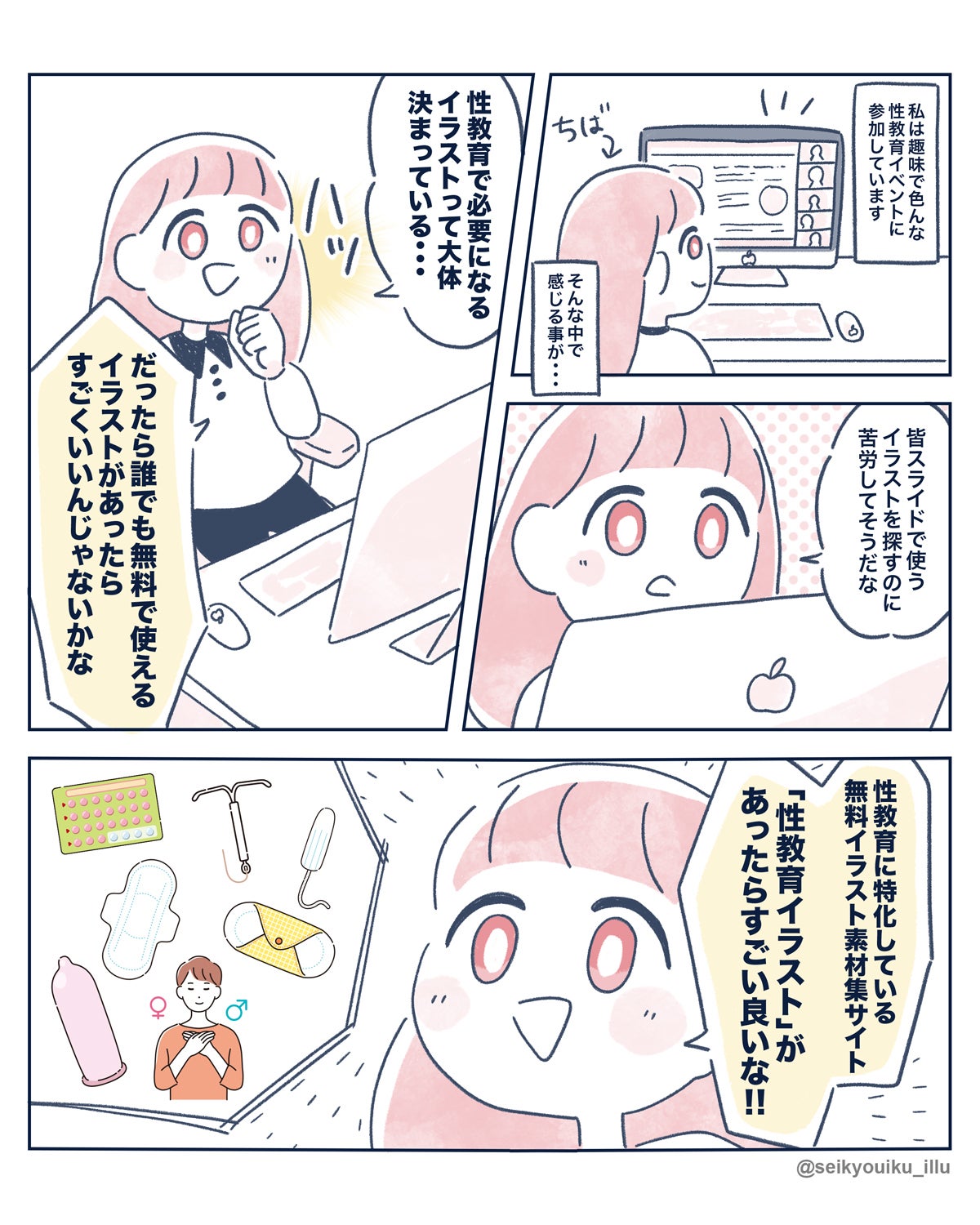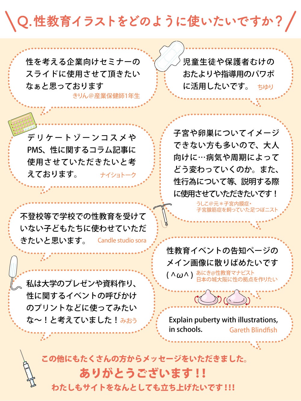 このイラストの素材をたくさんの性にまつわるアクティビストさんに使ってもらい、日本の性教育をもっと進めていって欲しいです!