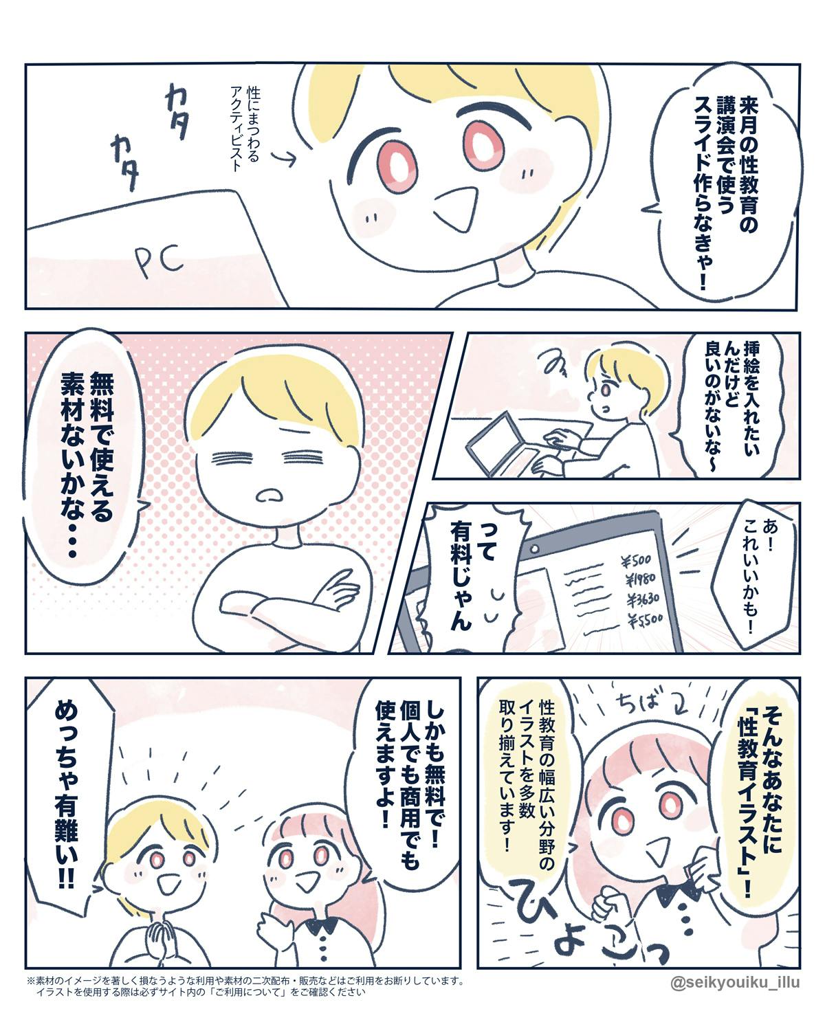 その性知識を広げるために、教育現場やメディア、大学内、SNS、イベント、家庭内など様々なところで活動をしている人たちがいます。しかし、なかなかテーマにあったイラスト素材がなく、テキストが多くなってしまうように感じます。