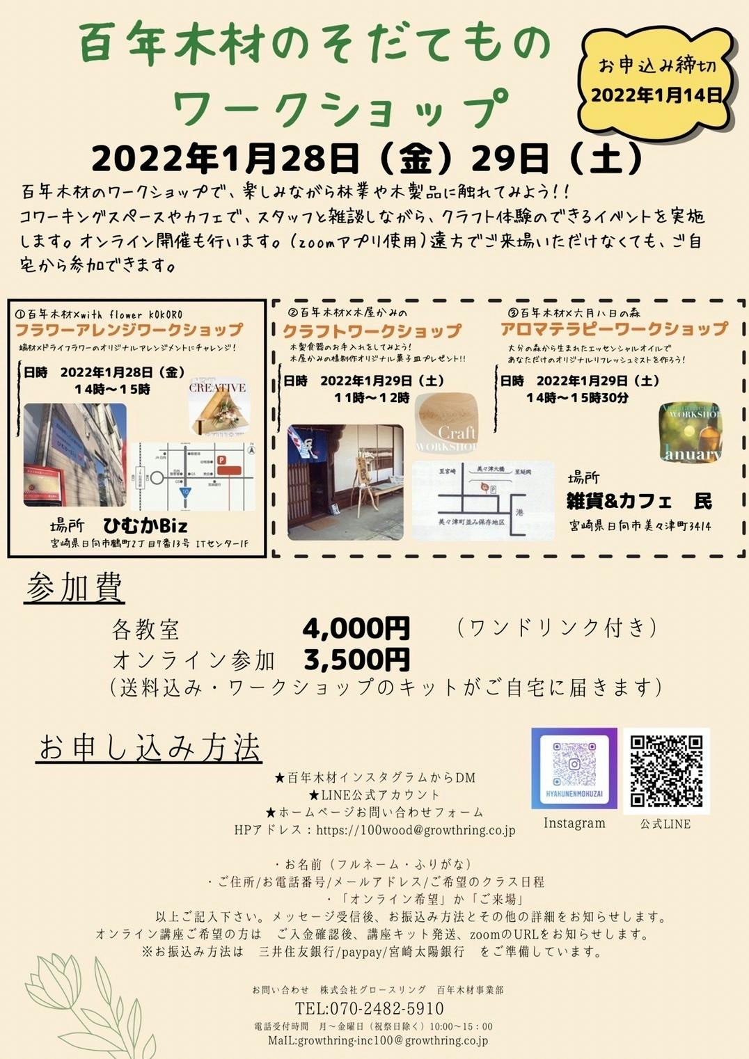 2022/01/05 09:46おはようございます!マネージャーの林です!本日、百年木材は仕事始め!!製材所は早朝から元気に動いております^ ^もう間もなく、神社の方が来てくれて、お祓いの時間です(╹◡╹)今年も事故や病気なく、安全に楽しくお仕事ができますように。頑張って参ります!ここで百年木材からのお知らせです^ ^百年木材 今年最初のイベントはワークショップ!!こちらは、オンラインで受講可能ですので、遠方からのご参加ドシドシお待ちしております!私、林が講師を務めます。(一部アシスタント)ご支援者さまと直にお話させて頂けることを楽しみにしています!詳細は下記の内容をご覧ください(╹◡╹)☆百年木材のそだてものワークショップ★-2022年1月28日(金)29日(土)-、た百年木材のワークショップで、楽しみながら林業や木製品に触れてみよう!!コワーキングスペースやカフェで、スタッフと木の学びを深めながら、クラフト体験のできるイベントを実施します。同時にオンラインでも開催します(ZOOMアプリ使用) 遠方でご来場頂けなくても、ご自宅から参加できます。①百年木材×with flower KOKORO 端材×ドライフラワーのオリジナルアレンジメントにチャレンジ! 2022/1/28(金)14:00-15:00 ②百年木材×木屋かみの ク ラ フ トワークショップ 木製食器のお手入れをしてみよう! 木屋かみの様制作オリジナル菓子皿プレゼント!! 2022/1/29 (土)11:00-12:00 ③百年木材×六月八日 アロマテラピーワークショップ 大分の森から生まれたエッセンシャルオイルで あなただけのオリジナルエアミストを作ろう!! 2022/1/29 (土)14:00〜15:30 参加費各教室 4,000 円 (ワンドリンク付き)オンライン参加 3,500円 (送料込み・ワークショップのキットがご自宅に届きます)お申込み方法: ☆百年木材インスタグラムからDM☆LINE公式アカウント ☆ホームページお問い合わせフォームから, ・お名前(フルネーム)・ご住所・お電話番号・メールアドレス・ご希望のクラス・日程 の項目を入力して下さい。 メッセージ受信後、お振込み方法とその他の詳細をお知らせします。オンライン受講をご希望の方は ご入金の確認後、講座キット発送、zoomのURLをお知らせします。 ※お振込み方法は 三井住友銀行/paypay/宮崎太陽銀行 をご準備しています お申込み締切:2022年1月14日お問い合わせ 百年木材事業部 TEL: 070-2482-5910 以上、お知らせでした(╹◡╹)今日も元気に頑張りましょう(o^^o) もっと見る