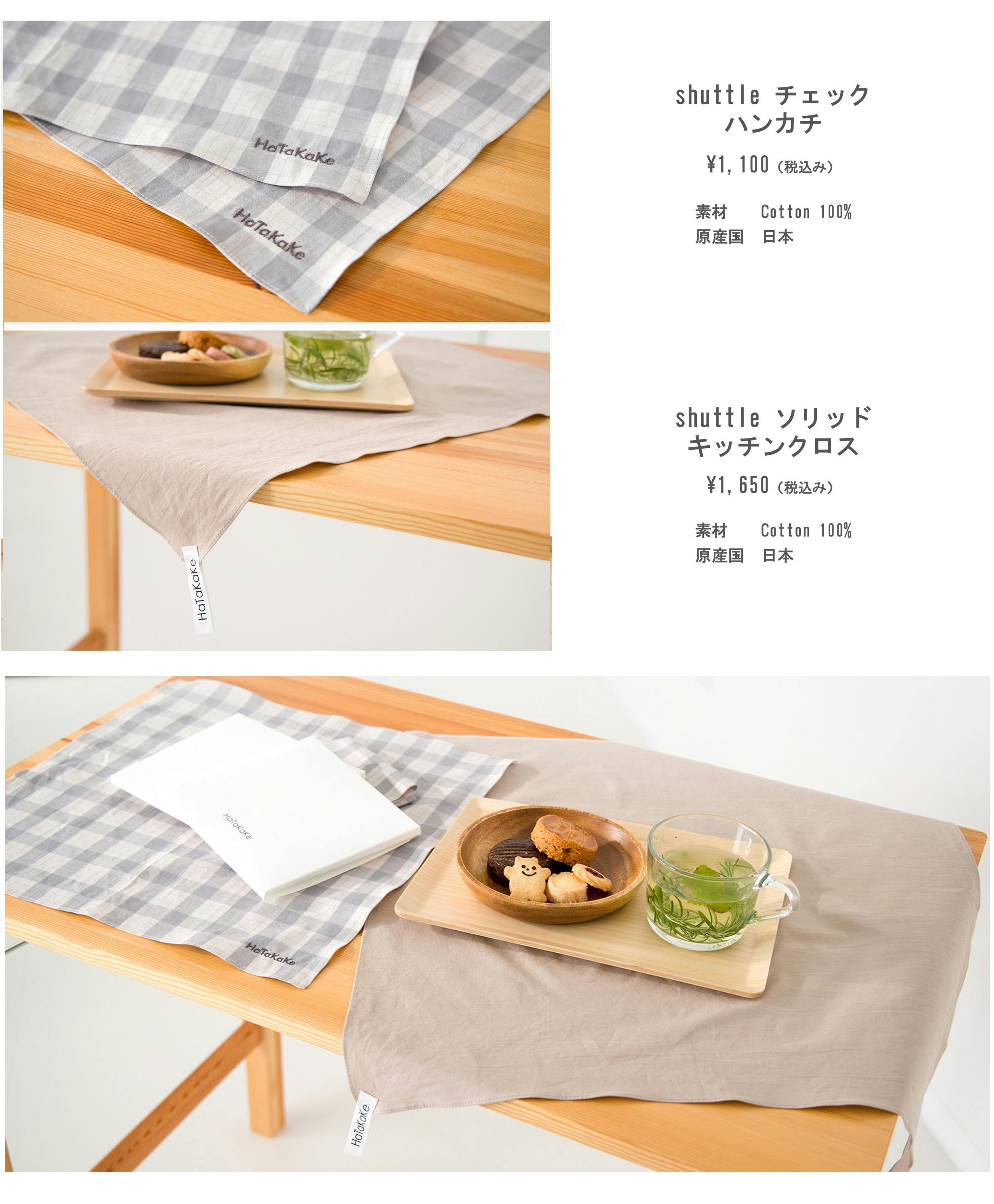 生地を味わっていただきたいと思い、ロゴの刺繍を入れたチェックのハンカチと、HaTaKaKeオリジナルタグを付けた無地のキッチンクロスを仕上げました。
