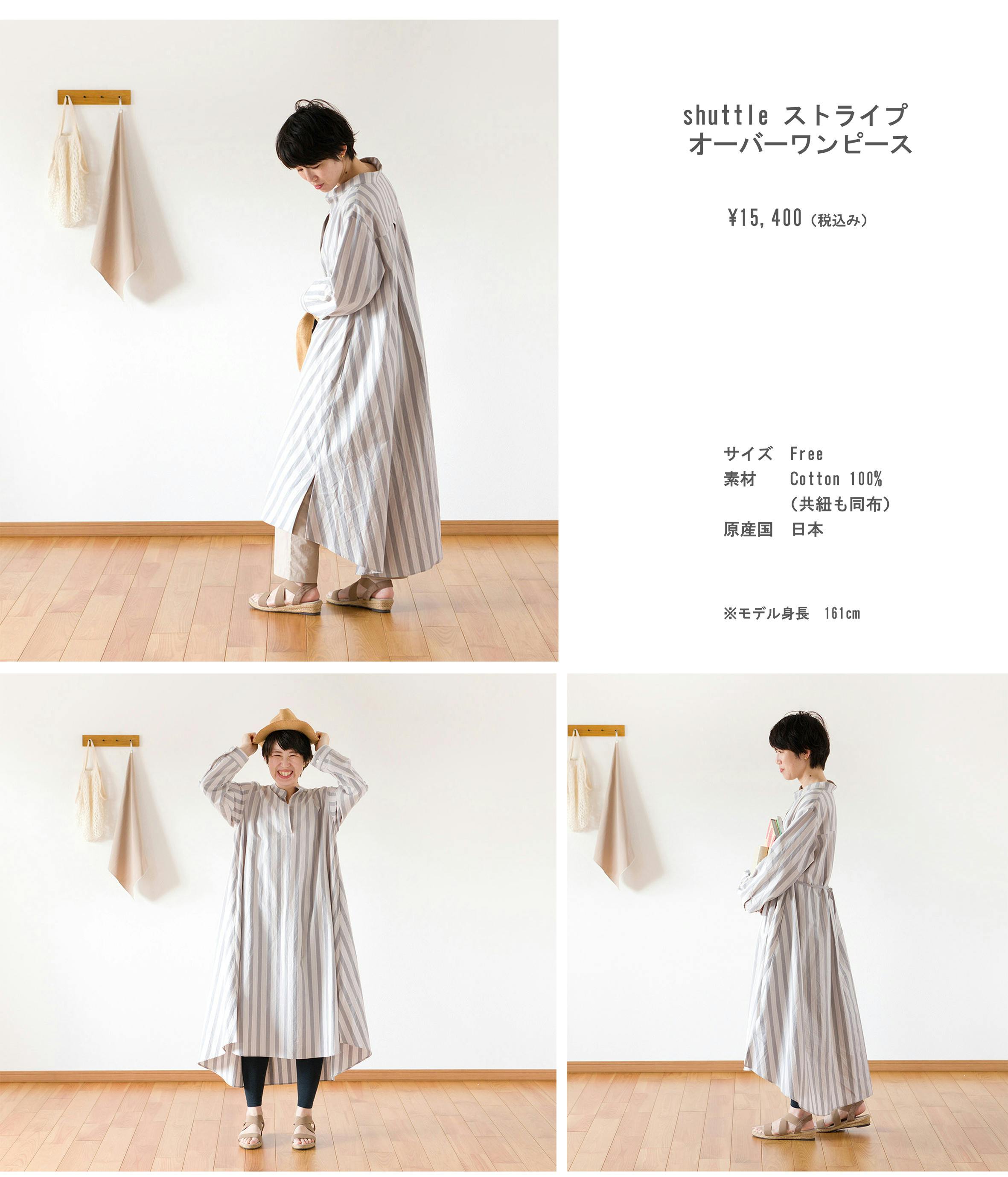 この織機を使うにあたり、私たちにはこの織機が活躍した当時の"播州織らしさ”を表現したいという思がありました。過去の資料をベースに、懐かしさに今らしさを加えたいと考え、播州産地の定番柄であるギンガムチェックに淡いトーンの細線を配しました。この繊細な雰囲気が、リラックス感の中に外出着としても取り入れやすいスマートさを演出しました。加工でも人工的な薬剤を使用せず、シワを残しとことんナチュラルな風合いを追求し、合計3点のオリジナル生地を仕上げています。※シワを残しています。