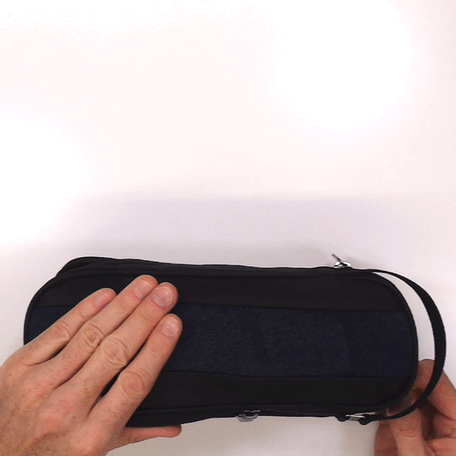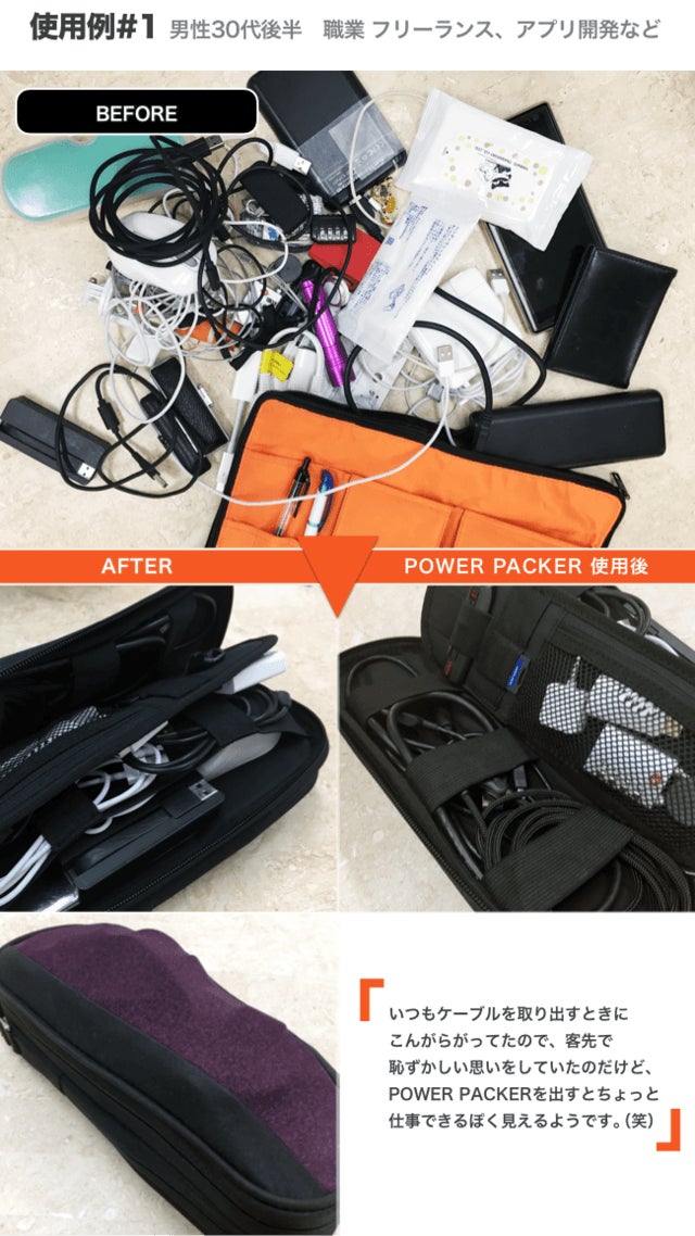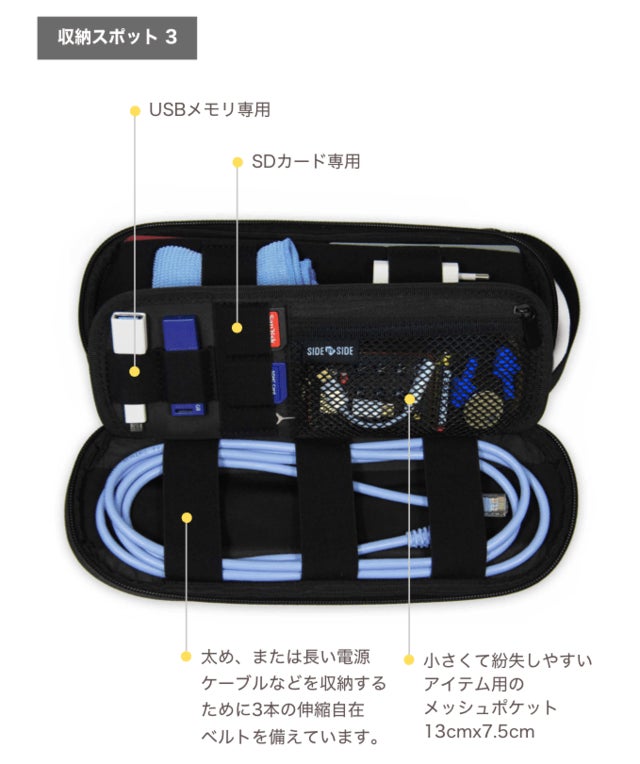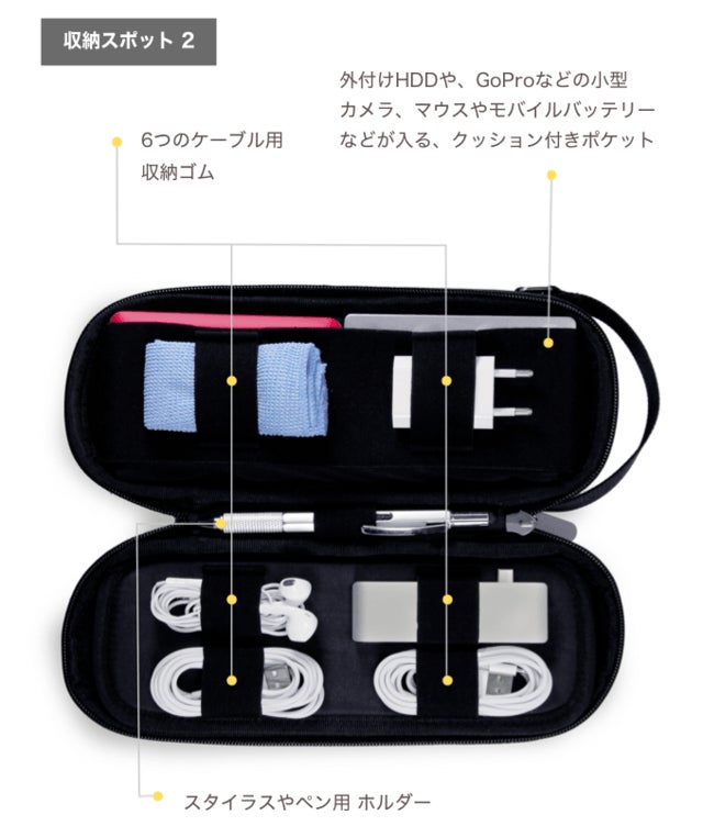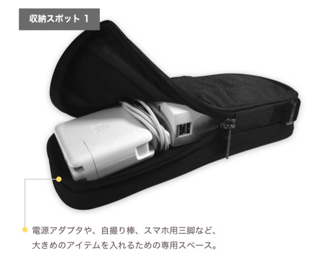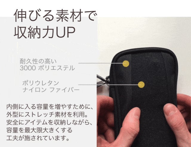 ケーブル、ACアダプタ、SDカードや細かいアイテムを収納できるメッシュ付ポケットなど、ここまで細かく分類して収納できるデザイン性の高い製品は市場にありませんでした。また、外側にストレッチ素材を使っているため、ミニ三脚や自撮り棒など、サイズの大きいものも収納できるのが特徴です。海外では、今年KickstarterやIndigogoで購入者を募り「こういうのが欲しかった!」との声が集まり、1万個以上の販売実績があります。