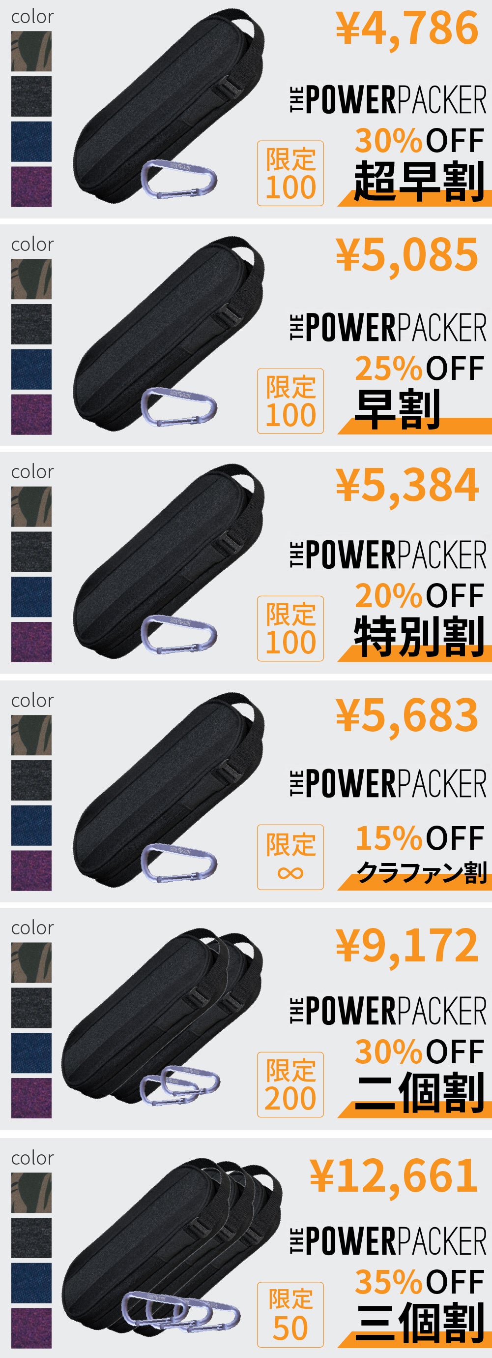 今回は多くのご要望をいただきました復刻カラー、カモフラージュの一般販売に先行し、感謝の気持ちを込めてPower Packerとカラビナのセットを特別価格にて提供させていただきます。