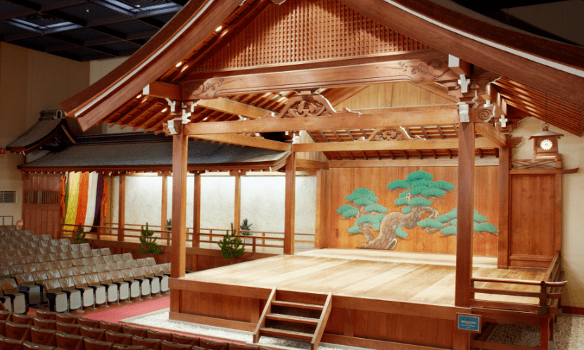 さらに舞台の中でも、バックコーラスの役割をする「地謡」が座る地謡座、笛や大小の鼓、バチを使って演奏する太鼓で演目の音楽を担当する「囃子方」の座る後座と演者がメインで使う本舞台に分かれています。