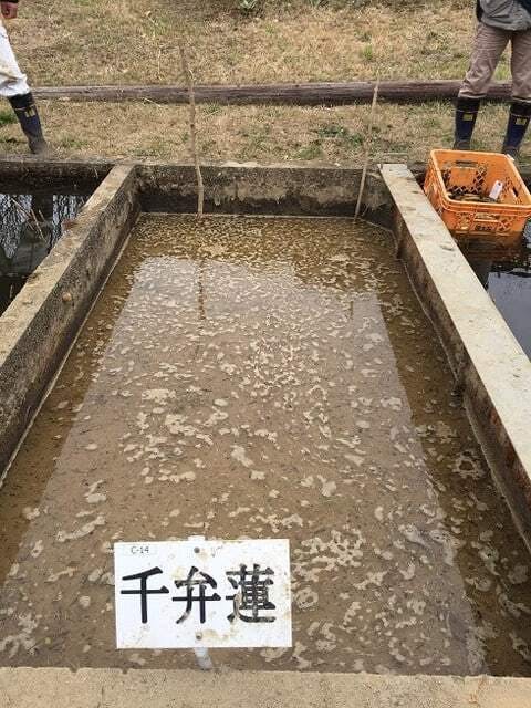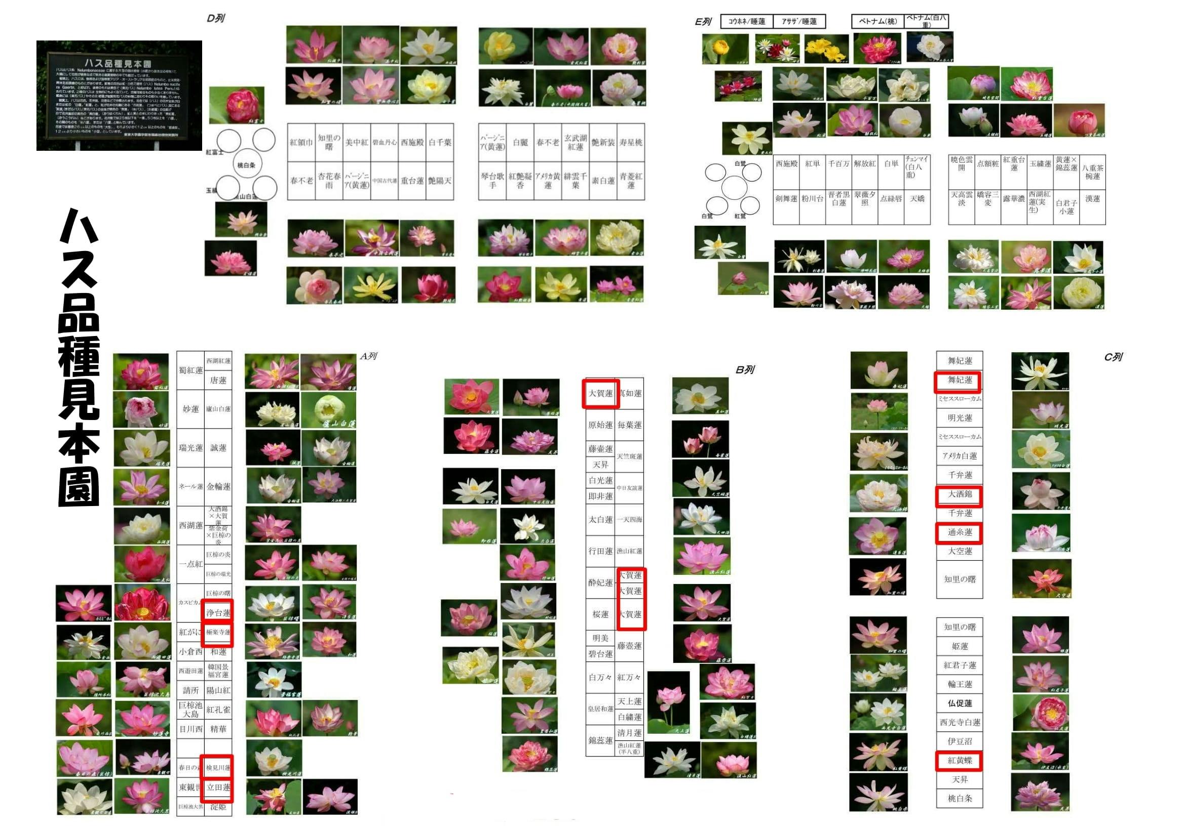 大賀蓮(2枡)舞妃蓮(1枡)紅黃蝶(1枡)浄台蓮(1枡)極楽寺蓮(1枡)検見川蓮(1枡)立田蓮(1枡)太酒錦(1枡)通糸蓮(1枡)