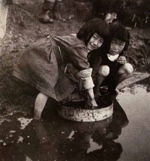 大賀一郎博士は、1917年に南満州の普蘭店(ふらんてん)において、約500年前の古蓮の種を発見し、開花に成功していました。帰国後もハスの研究をつづけ、千葉県千葉市の東京大学検見川厚生農場で発掘された古代の丸木舟のことを知り、「ここを掘れば必ず蓮の実がある」と確信し、スコップ1丁と1万円を携えてやってきたと言われています。68歳のときでした。大賀博士の情熱にうたれた地元民の理解と協力をもとに、1951年3月はじめに古代蓮の発掘がはじまりました。下の写真は泥をふるう子どもたちの姿です。