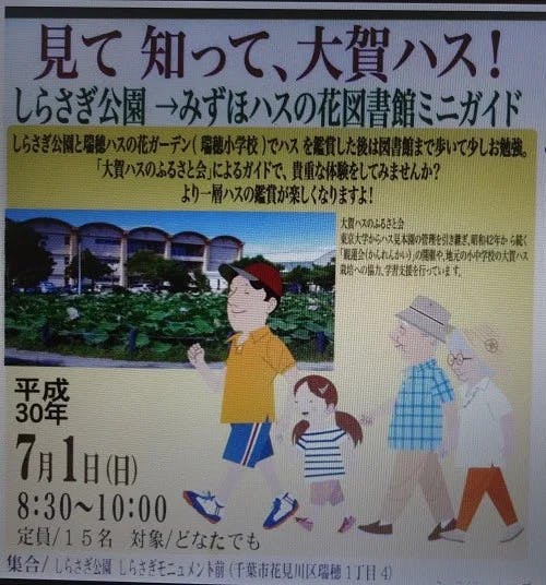 2018年7月にはみずほハスの花図書館のイベント「見て 知って大賀ハス!」でハスのガイド役を務めました。ハスウォーキングでめぐる千葉のまち、という千葉市のコンセプトで行われました。