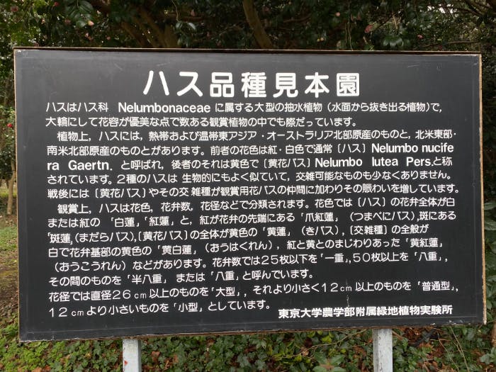 ハス品種見本園では、東京大学農学部附属緑地植物実験所の研究者たちが世界中から集めたハスを見ることができます。大賀ハスのふるさとの会は、大賀ハスをはじめ日本各地のハス、中国系のハス、アジア系のハス、アメリカ系のハス、ロシアのハスなど120品種ほどの維持・管理を行っています。