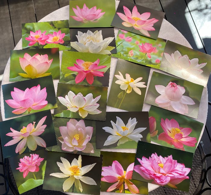 実行者からのご支援に対する感謝の気持ちを、お手紙にして送らせていただきます! このお便りにハス品種見本園で育つハスたちの美しいポストカード20枚を同封します。写真は大賀ハスのふるさとの会のボランティアが撮影しました。ポストカードのハスの品種のご指定は承ることができませんので、予めご了承ください。下の写真は、お届けする20枚セットの一例です。