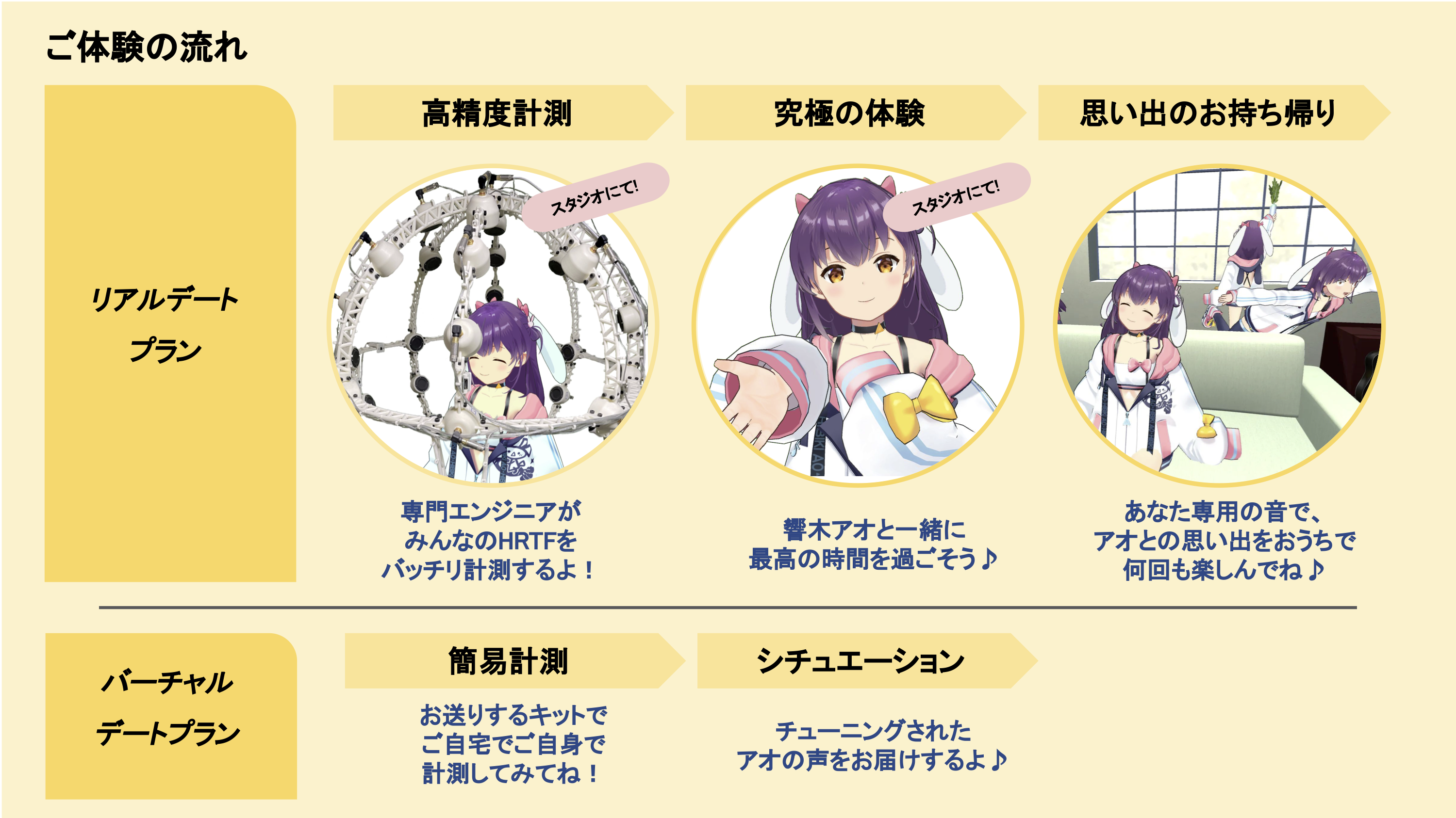 こちらは専用に開発されたHRTF計測キットをプラン購入者のもとに送付し、ご自身で計測していただいたHRTFを元に自分だけのために最適化されたコンテンツを体験していただくプランになります。音源データは今回の為に特別に制作された響木アオのとある一日を体験するオリジナルコンテンツとなっています。