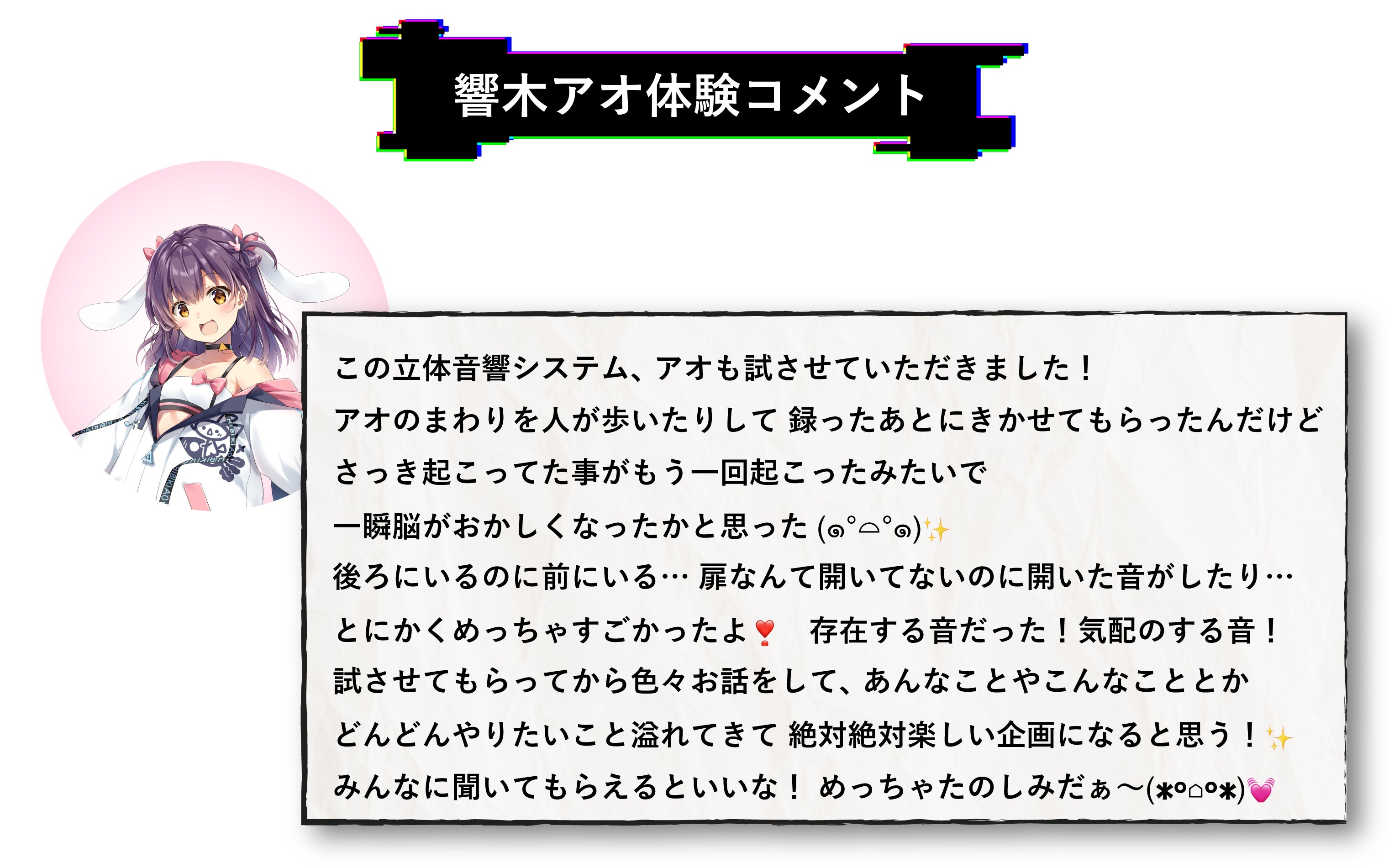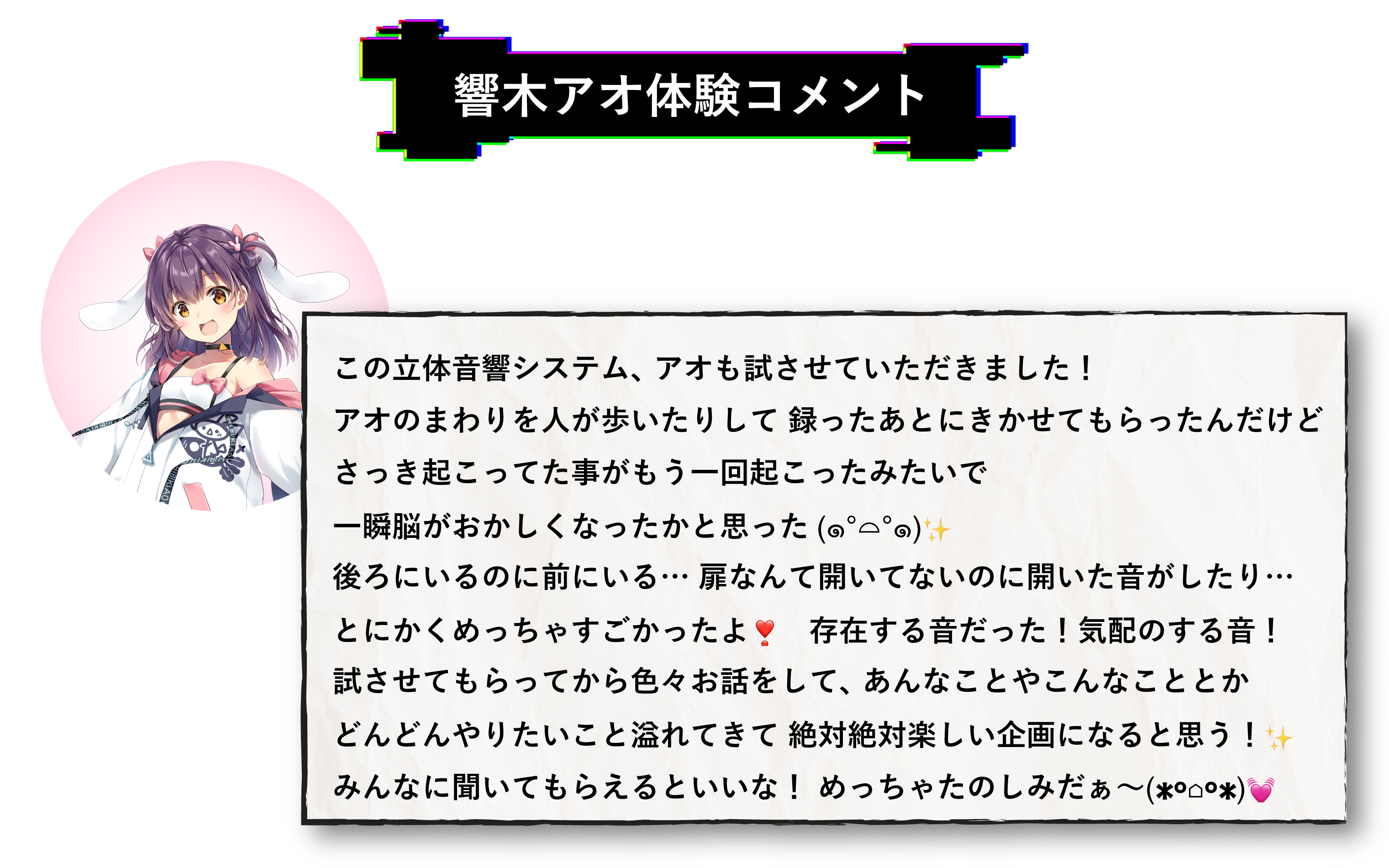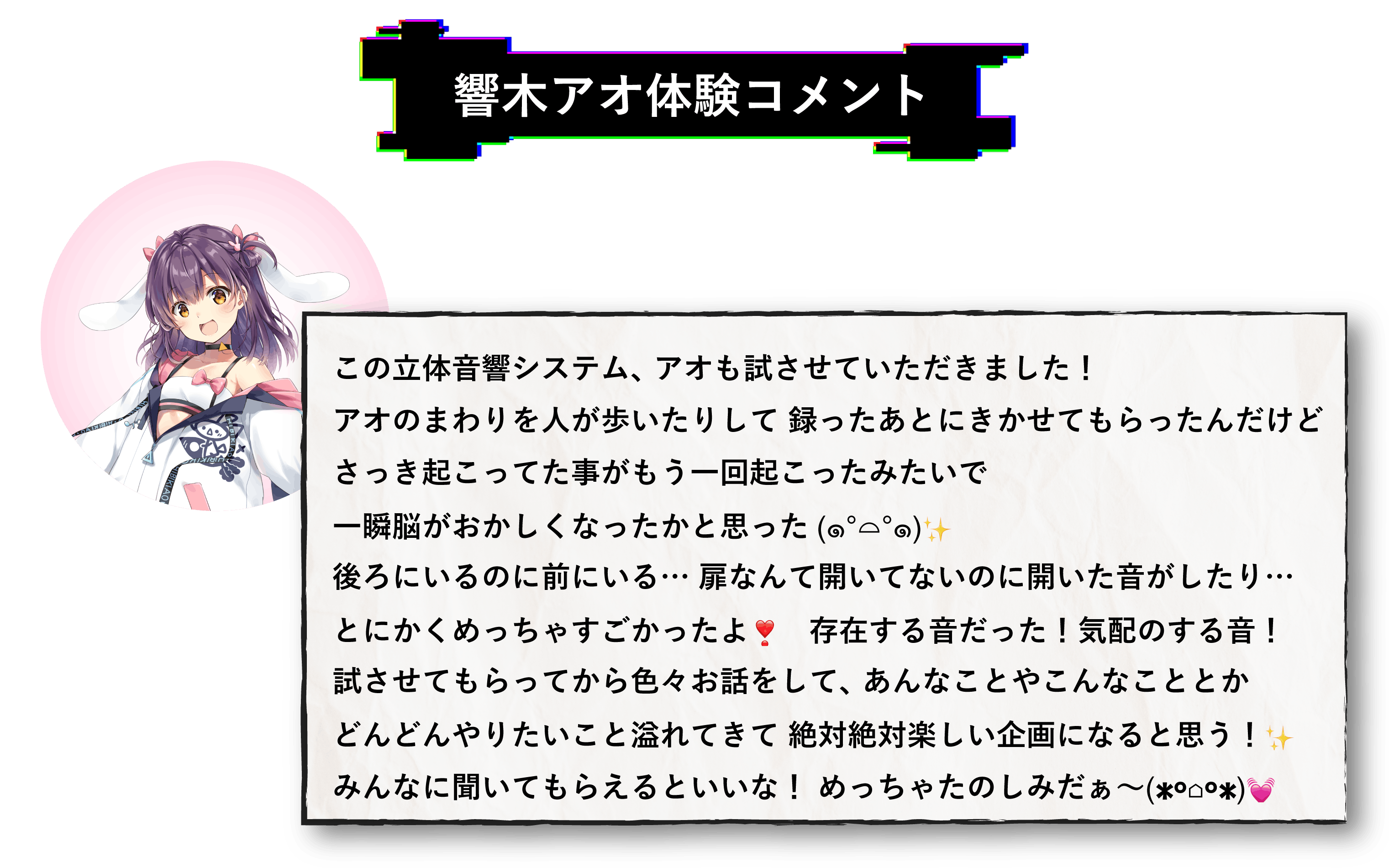 A:従来のバイノーラルやASMRは、平均的な耳の形をしたマイクで録音されたものでした。今回は、支援者の方、個人個人の耳に合わせますので、より一層、響木アオちゃんの存在感を感じることができます!