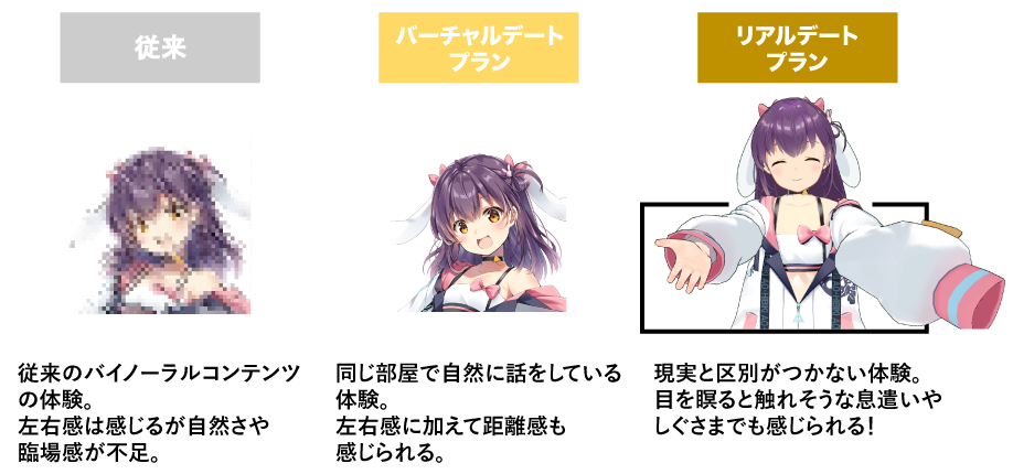 A:違います!文章で説明するのがとても難しいのですが、現状オンラインで視聴できる通常のバイノーラルやASMRをよくした体験がバーチャルデートプラン、実際にリアルで聞いているのとほぼ変わらない体験、まるで自分の部屋の中に響木アオがいるかのような体験をできるのがリアルデートプランです