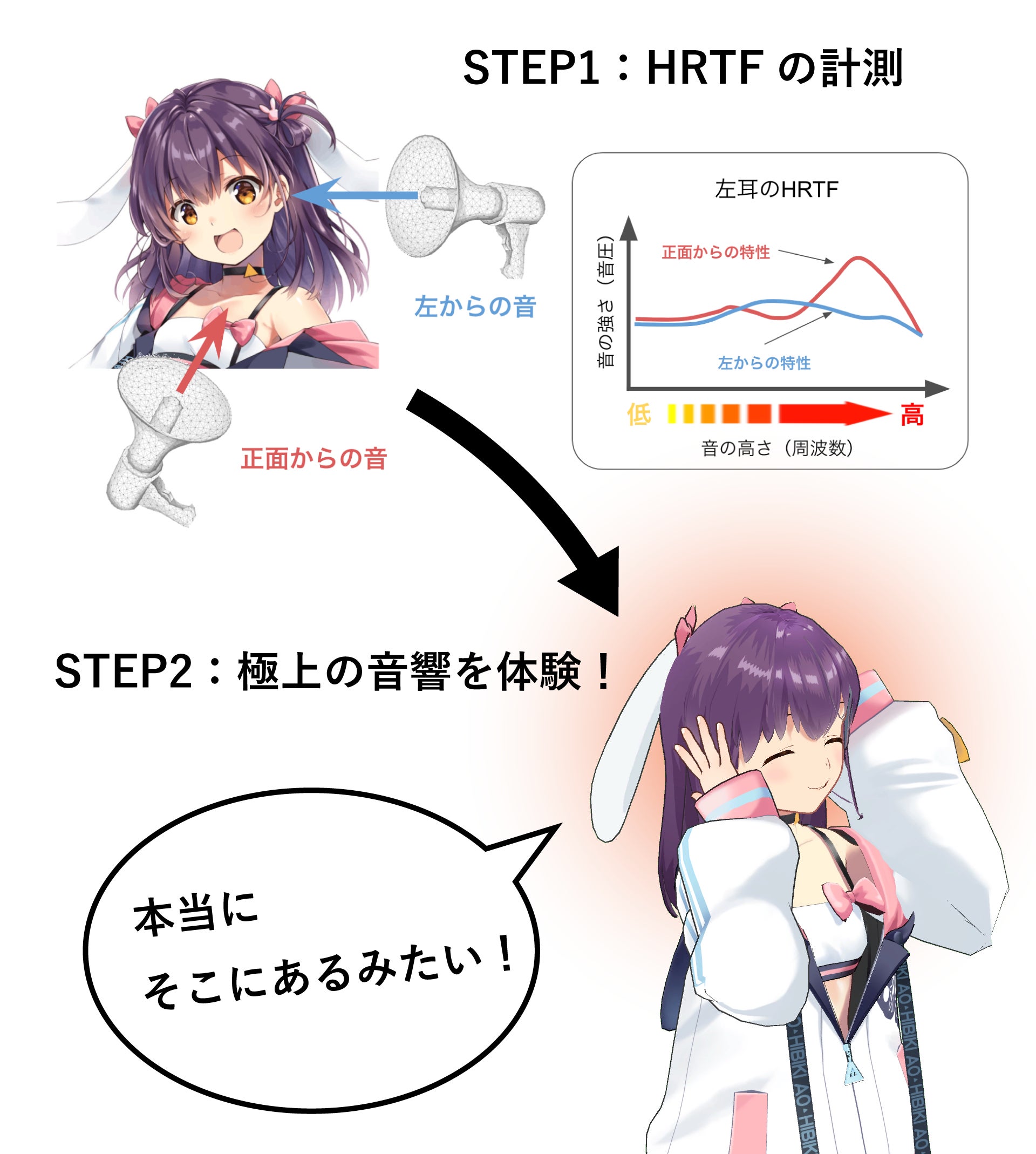 この人間の身体的特徴による音の変化を反映し、ヘッドホンで立体的な音を再現するために"HRTF(頭部伝達関数)"という音響特性が存在しており、現在も様々なコンテンツにて活用されています。