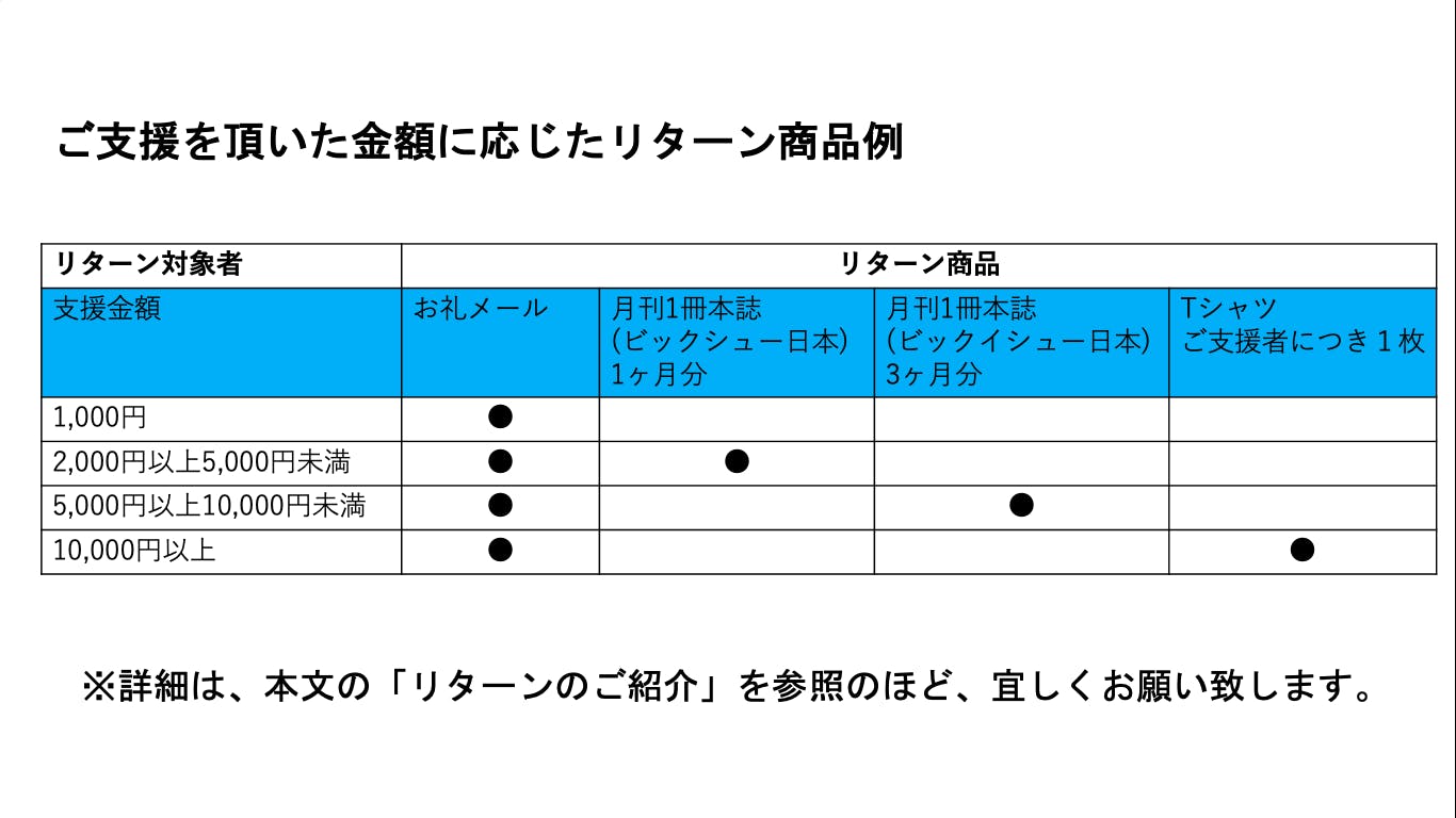 >この度、ご支援を頂いた金額に応じて下記のリターン商品を提供させて頂きます。