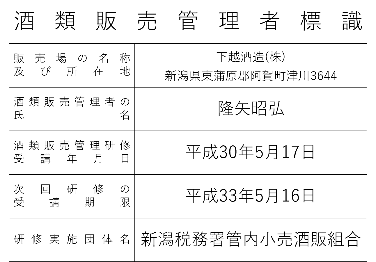 また、上記の酒類を含むリターン清酒「蒲原」については、本プロジェクトの共同起案者である下越酒造株式会社様の協力で実施させていただきます。酒類販売免許番号・管理者標識は以下の通りです。