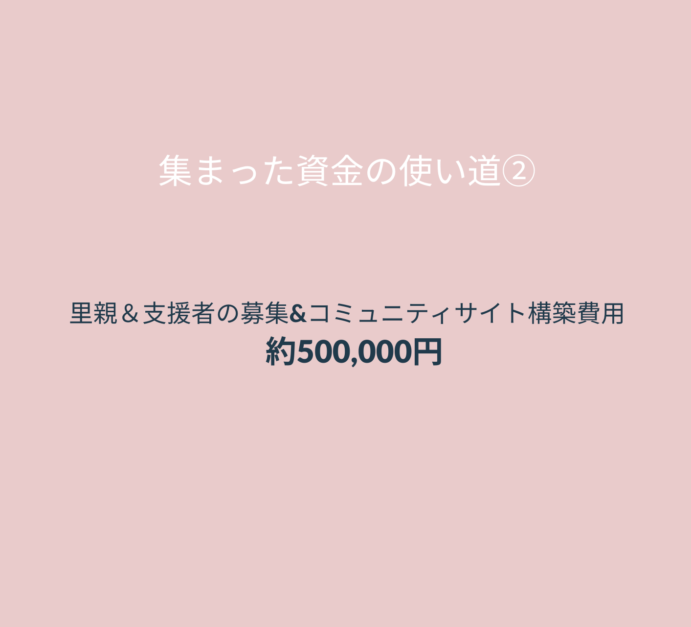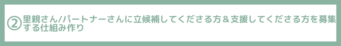 新しい里親さん/パートナーさんに立候補してくださる方を全国から募集出来るようなウェブのシステムを作ります。また、ご事情で里親さん/パートナーさんにはなれないけれど、資金支援をしたいと言ってくださる方向けに、支援金を募集出来るサイトも併せて作ります。