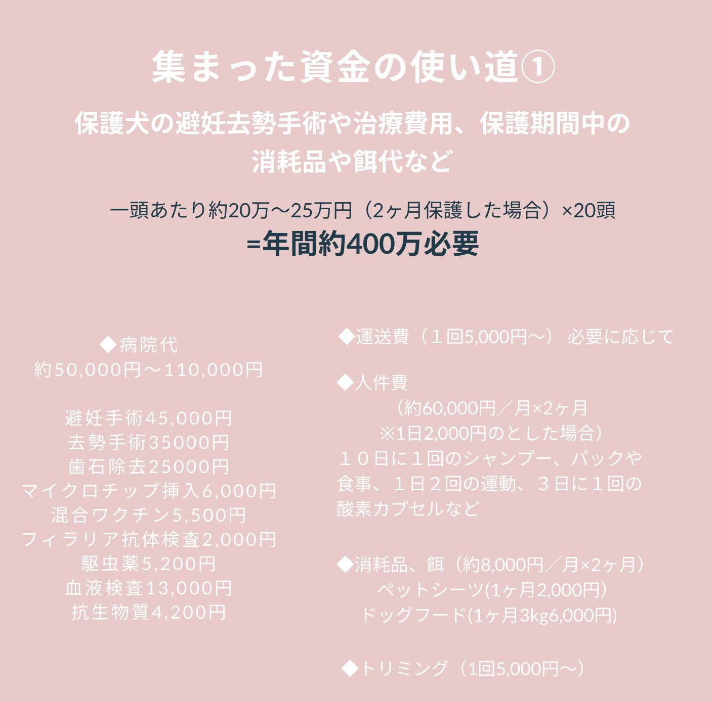 「資金がないならやらなければいい」いうご意見もあります。しかし、目の前にいる保護犬たちのいとおしい命を見逃すことはやはり出来ないと感じて、「たった一つの命でも助けたい。」その想いを一つずつつないでいこうと思い今回のプロジェクトを立ち上げました。