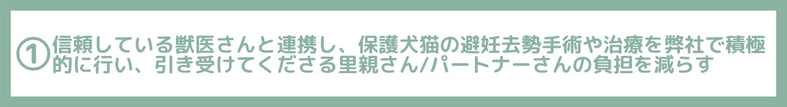 高齢で、持病を抱えている子たちを譲渡する際、一般的な譲渡では、お引き受け頂く里親さん/パートナーさんからご負担頂くケースが多いです(約6万円)。ご家庭でのケアを負担なく継続して行ってもらうために、私たちで出来るケアや資金調達を行い譲渡のハードルを下げお引き受けいただく件数を増やしたいと思っています。