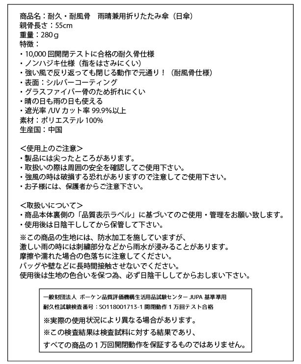 ・絶対に壊れないということを保証するものではございません。過度な力を加えたり、強風により破損する可能性はございます。通常の傘より壊れにくい仕様となっていることをご理解の程お願いいたします。