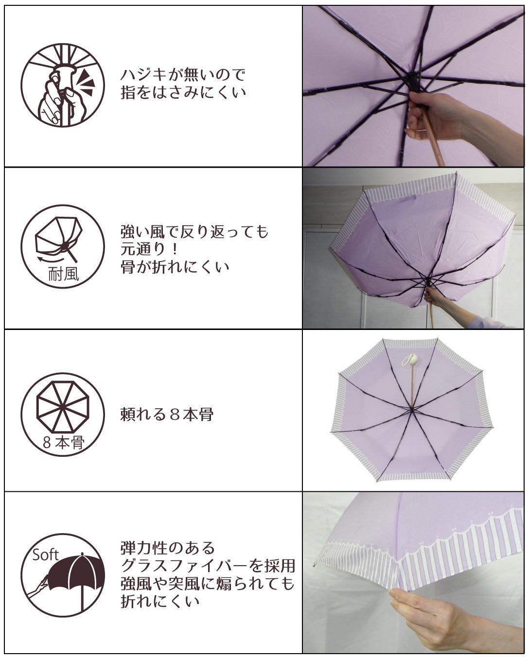 耐風骨仕様・・強風で骨がひっくり返っても閉じる動作をすれば元に戻ります。