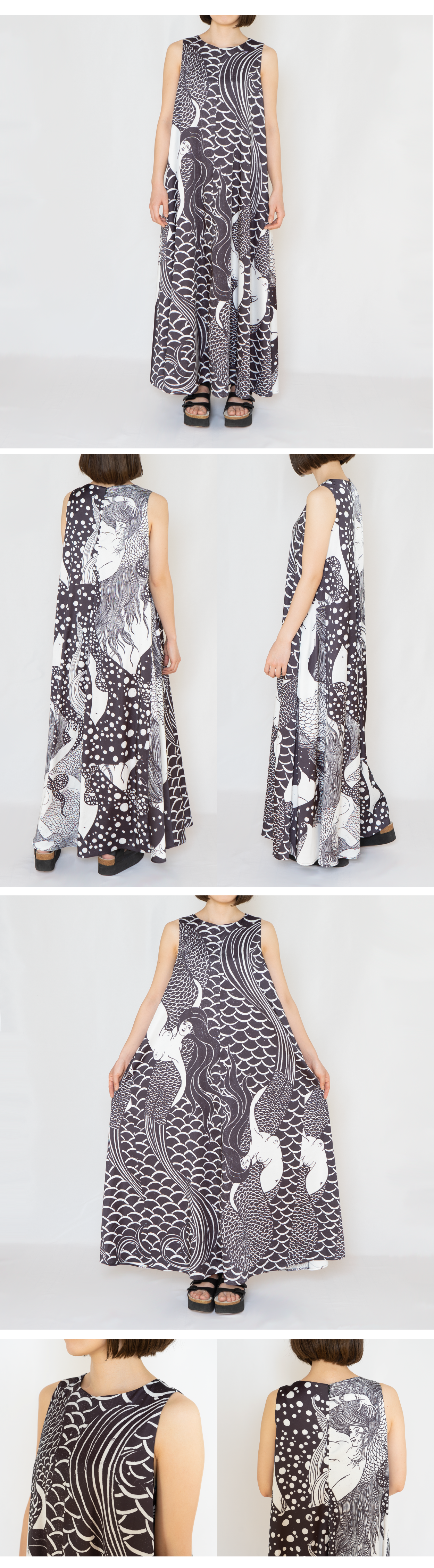 「水島爾保布(みずしま におう) 先生の絵は、物語性があります。「エロス」と「耽美」に満ちた人魚が、大きな布の中で泳いでいる様を、ドレスにコラージュした、『人魚物語のドレス』です。」