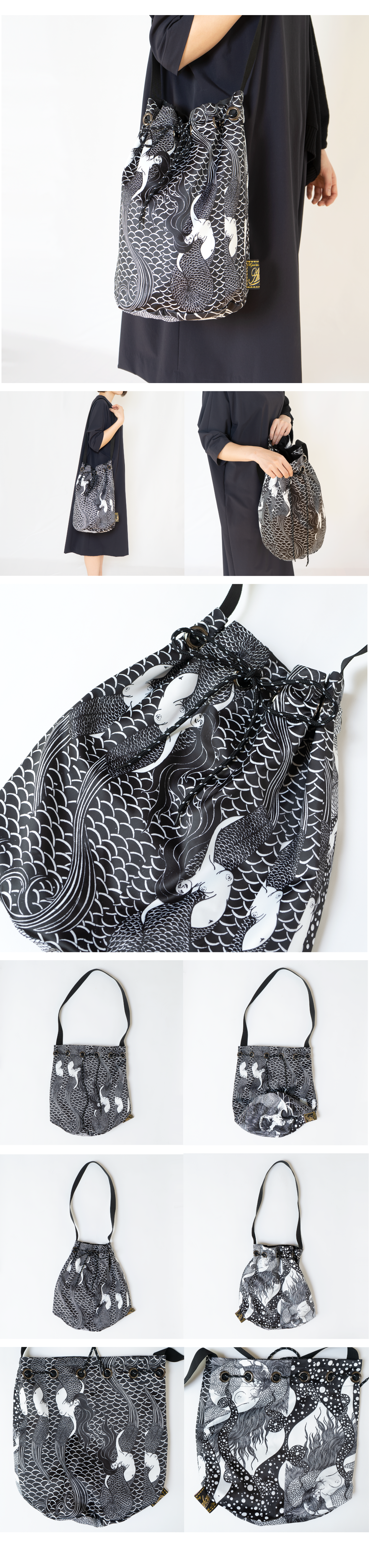 人魚からイメージしたプールバッグのような形の巾着は、肩からかけられる仕様。大胆な柄も小物なら取り入れやすい。