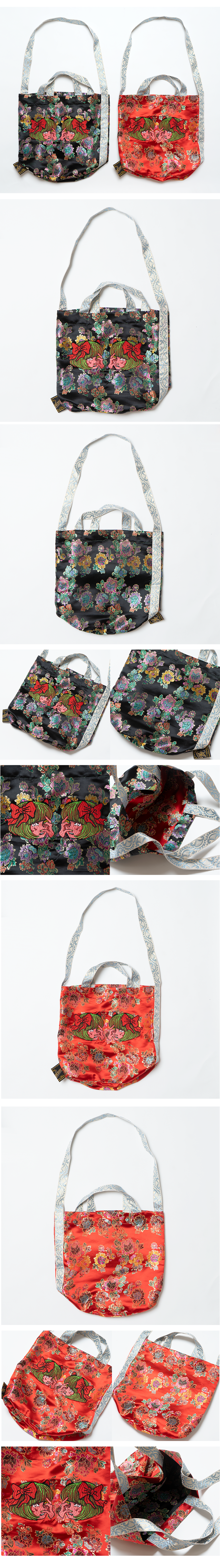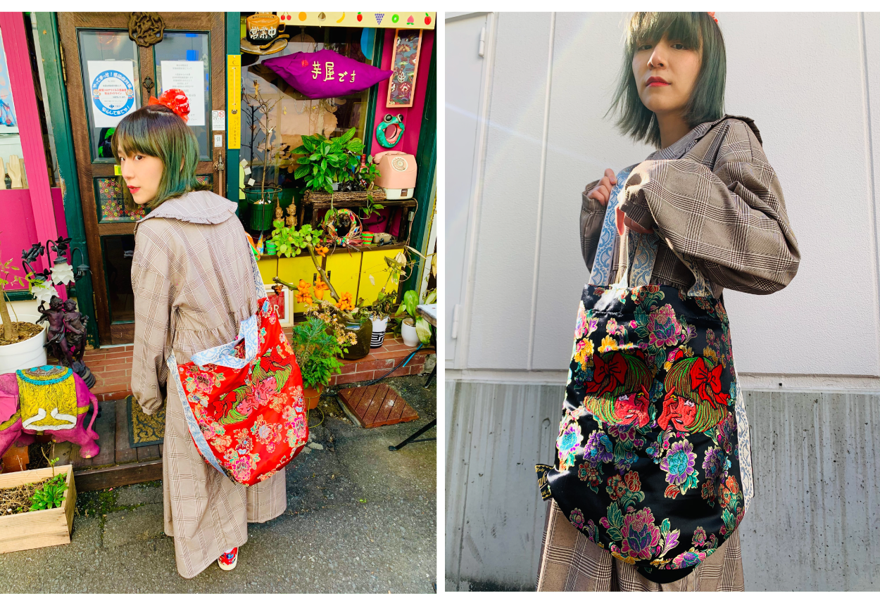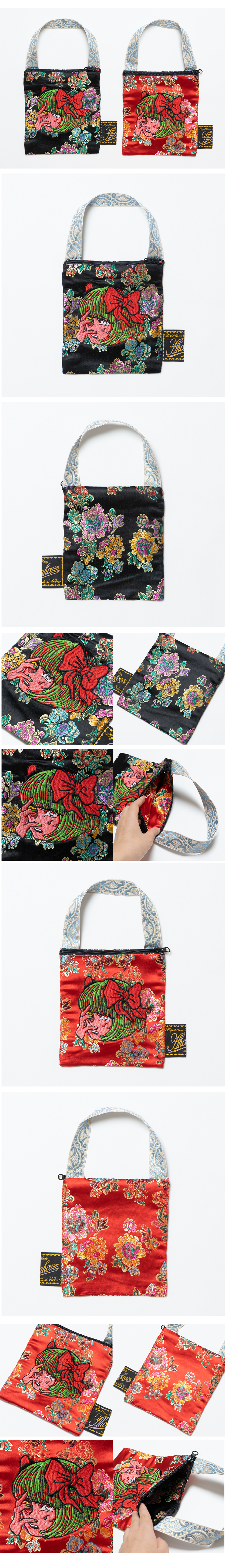 原田さんの描いた女の子をベースに、チャイナ生地のビッグトートとミニバッグができました。赤と黒のどちらも素敵なので迷ってしまいますね。デザイナーより「原田ちあきさんのポップでシュールな感じが、現代風あやしい絵のようで、とても素敵です。 なにか、、、異国の生地をあわせることで、もっとPOPであやしい無国籍な感じのするバッグです。」