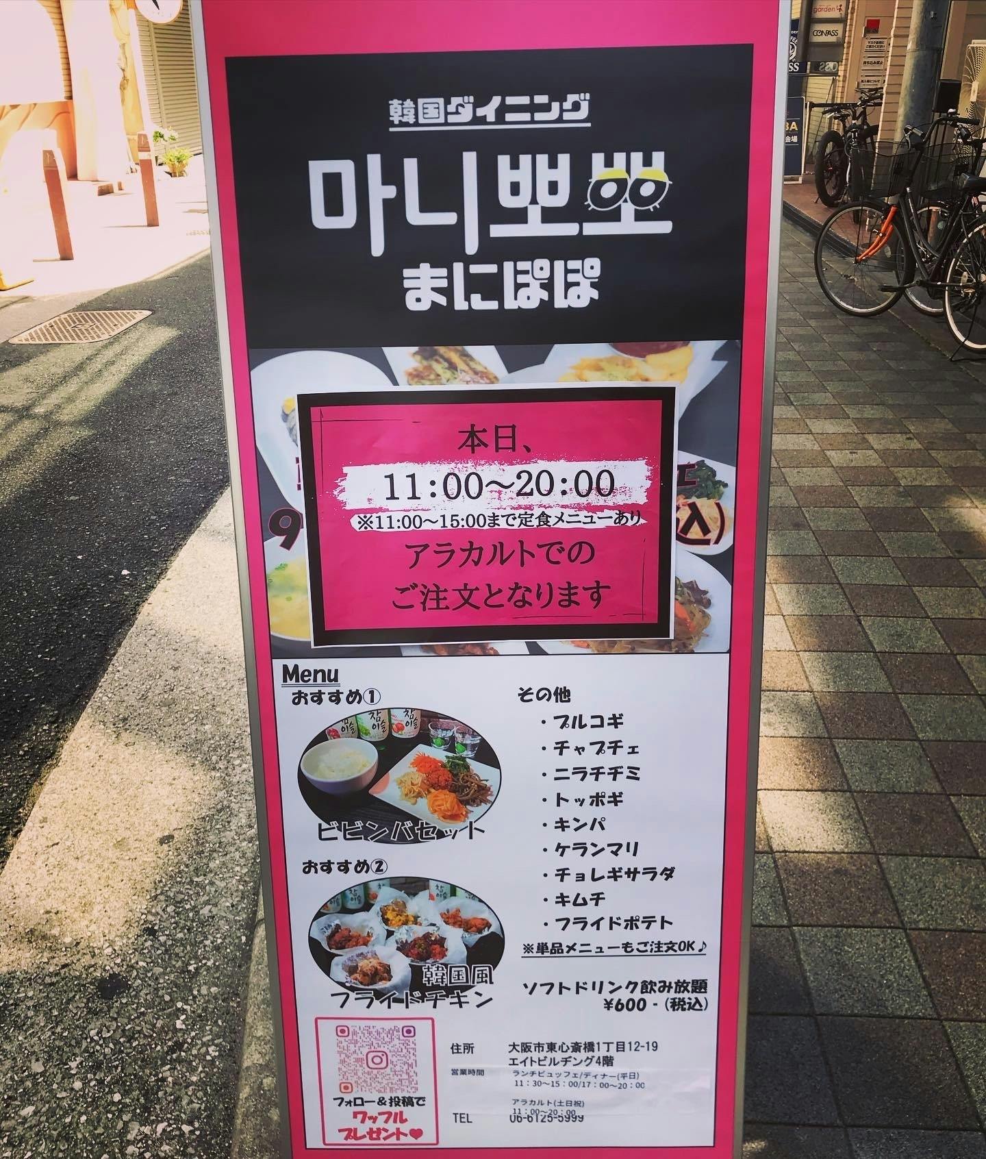 2021/04/13 12:27こんにちは!「韓国ダイニングまにぽぽ」です。現在、大阪ではまん延防止等重点措置が発令されており、5/5まで飲食店は20:00閉店するように要請されております。それに伴い、まにぽぽも5/5までの期間の営業時間を、下記のように変更いたします。【変更前】●平日11:00〜14:00ランチビュッフェ 18:00〜24:00ディナー●土日祝11:00〜14:00ランチビュッフェ 16:00〜24:00ディナー↓【変更後】●平日11:30〜15:30ランチビュッフェ 17:00〜20:00ディナー●土日祝11:00〜20:00アラカルトでのご注文(11:00〜15:00は定食あり)何卒、ご理解、ご協力をよろしくお願いいたしますm(__)m もっと見る