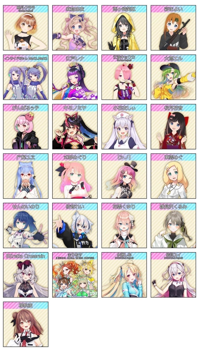 暁月クララ・雨ヶ崎笑虹・インサイドちゃん Mark1 Mark2・江波キョウカ・式部めぐり・東雲めぐ・まりなす・水瀬しあ・結目ユイ