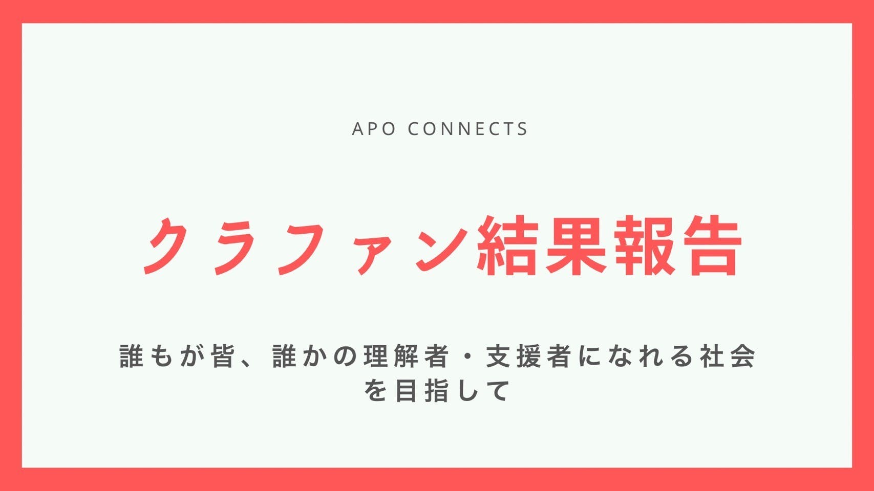 • みなさんこんにちはAPO connectsの玲奈です!4/14でAPOconnectcのクラファンが終了しました。本日は、これまでのご支援の状況と、私自身がもつ想いについて知ってもらおうと考えています。最後までお付き合いください!!【活動報告】支援者数:104名支援金額:245,680円目標金額:200,000円【リターン】キーホルダー19名缶バッチ35名アイコンフレーム18名缶バッチおすそ分けセット4名ステッカーで全力応援セット3名APOconnectsラバーキーホルダー×3おすそ分けセット3名Tシャツ17名APO connects全力応援セットリターンズ5名ステッカーで全力応援セット++2名APO connects全力応援セット++1名APO connects全力応援セット5名【APO connectsに掛ける思い】2021年4月14日にクラウドファンディングを終了しました!目標として掲げていた金額を大きくこえ、また100名を超える方にご支援していただいてほんとにありがとうございます!「誰もがみな、誰かの理解者・支援者になれる社会の実現」をビジョンとして掲げ、取り組んできました。私自身トランスジェンダーwの当事者ではありますが、私はだれかに助けられるだけのものではなく、私も誰かを助けることもできる。「誰がどのような状況であっても生きやすい社会」障がいがあるからセクシュアル・マイノリティだから外国人だから女性だから妊娠しているからなどといった理由で生きずらさを感じてしまう社会からだれもが「生きやすい」と思えるような社会を考えていかなければならないと考えています。セクシュアル・マイノリティの中では、これまでALLYという単語が使われてきました。これはセクシュアル・マイノリティに対する理解者という意味の言葉として使われています。現代社会ではALLYという言葉が浸透しつつあるのは、セクシュアル・マイノリティに対する課題意識が社会的に大きくなってきたからだと思います。でも、先ほど申し上げたように、社会にはセクシュアル・マイノリティの当事者以外にいろんなマイノリティ性をもつ方々が存在しています。「障がい者だから」「セクシャルマイノリティだから」助ける、あるいはその対象になるのではなく、「困りごとを抱えたから」という出発点から「助ける」という発想が生まれることは誰もが同じなのです。そして、困りごとを抱えたとき、それぞれがお互い助け合えるような社会(循環型相互扶助)で暮らす事ができたら、自分を含め、より気持ちよく生活できる人が増えるのではないかと考えました。そんな社会に少しずつ近づけていく為のこのクラウドファンディングは、小さくても価値はある、小さな一歩にはなる。今ではそう確信しています。それは、同じように信じてくださった104名のみなさまがいたからです。ここからは、7名のメンバーの思いだけでなく、111名分の思いを胸に進んでまいります。APO connectsとして、クラウドファンディングは一つの大きな契機となりました。そして、ここからが始まりです。もしよければ、私たちの「やさしいかくめい」を見守っていただけると幸いです。この度は、ご賛同、ご支援、拡散のご協力、本当にありがとうございました。これからも末長くAPO connectsの活動を応援していただけると幸いです。 もっと見る