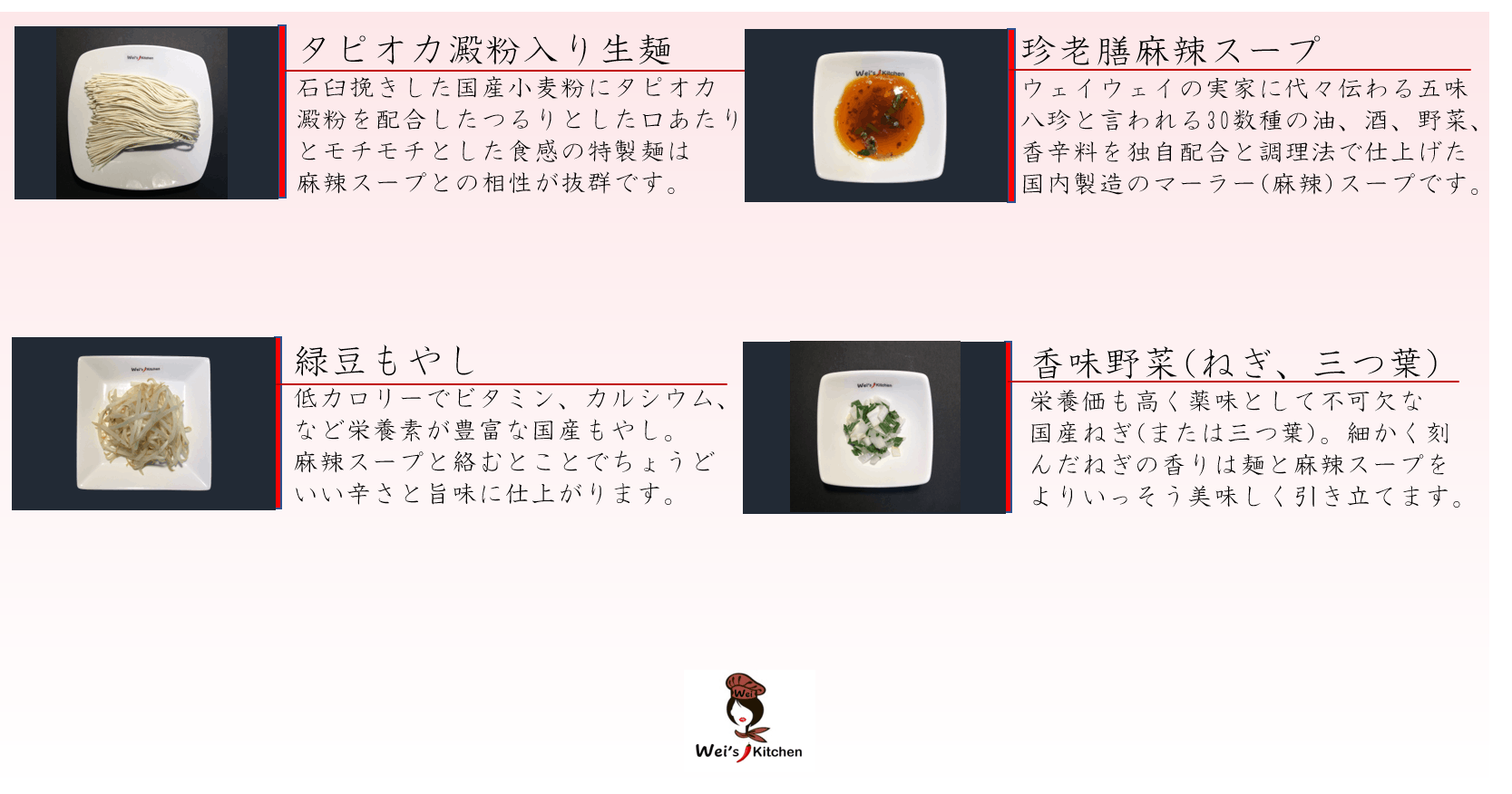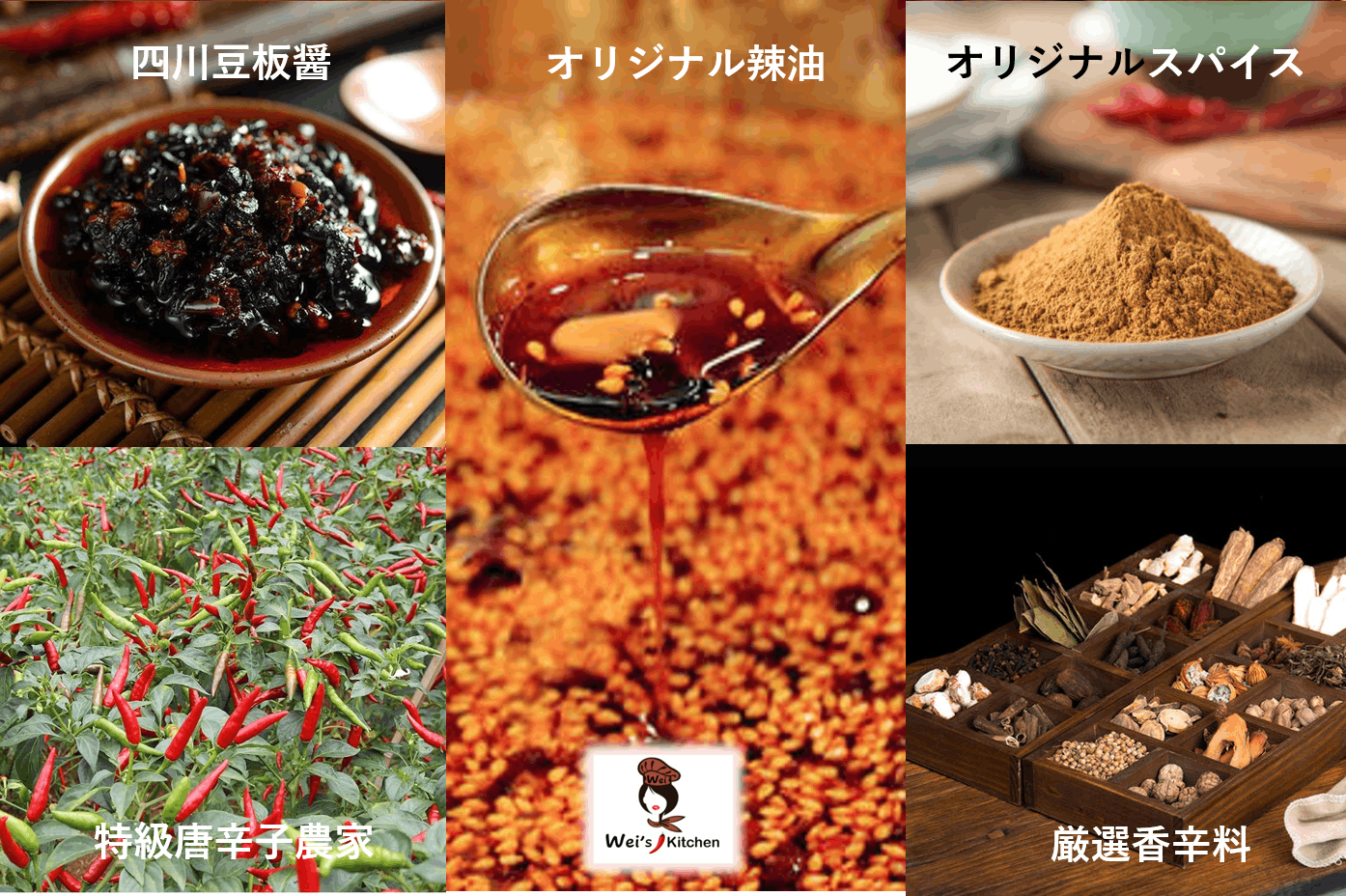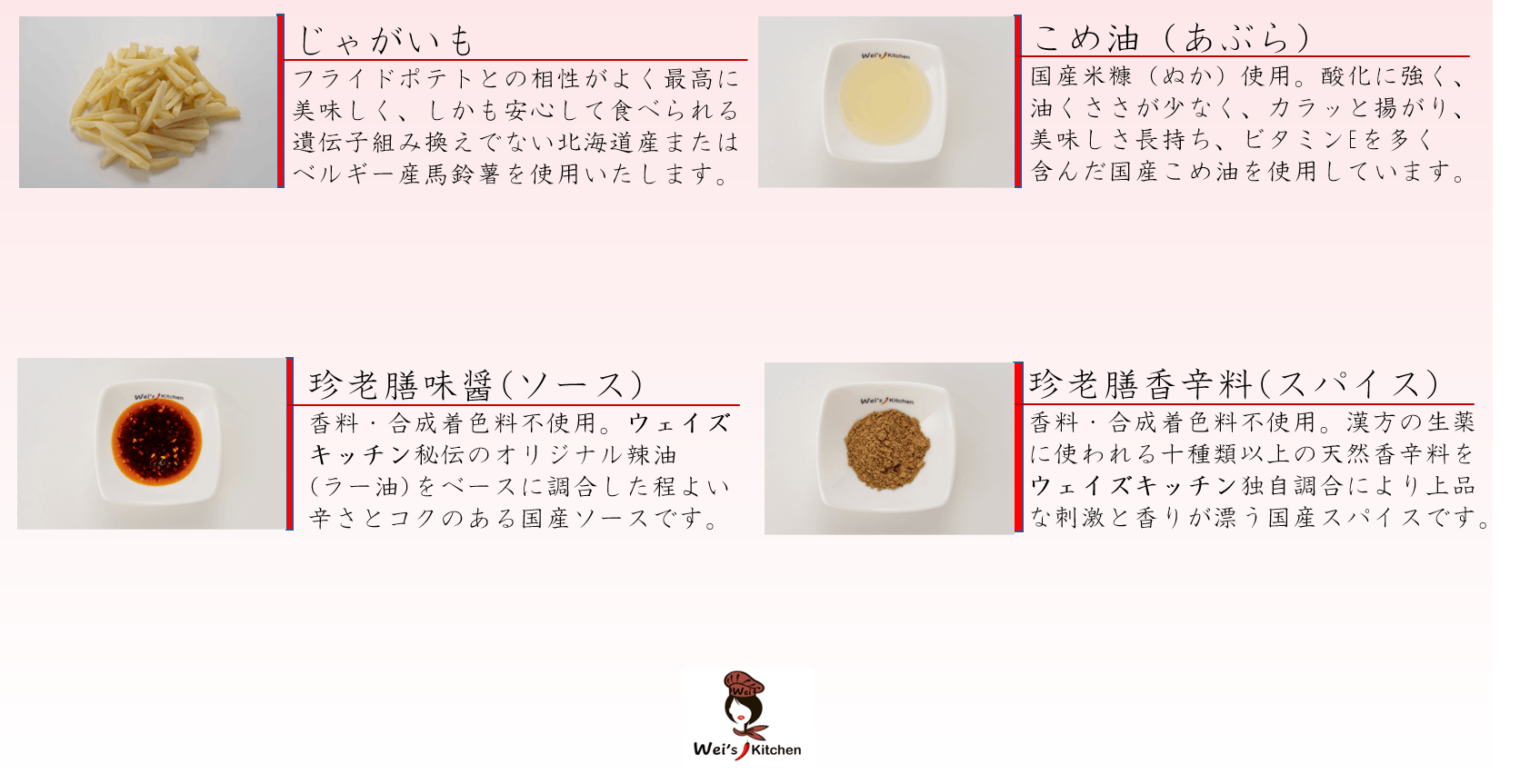 「ウェイズキッチン」は、四川省でしか入手できない香辛料以外ほぼすべて国産の食材を使用しています。この10年間で日本で知り合えたすばらしい多くの知り合いの方々(10代後半~60代までの男女)に何度もテイスティングの協力をしていただき、本場四川そのままの味で<食べたことがない旨みと香り><あっさりしているのにコクと深みのある旨さ!><辛いけどおいしい!><クセになる新鮮な旨みと香り!><冷凍から加熱した料理だと思えない旨みと食感!>などと言っていただける香味フライドポテトと四川マーラー麺に決めることができました。