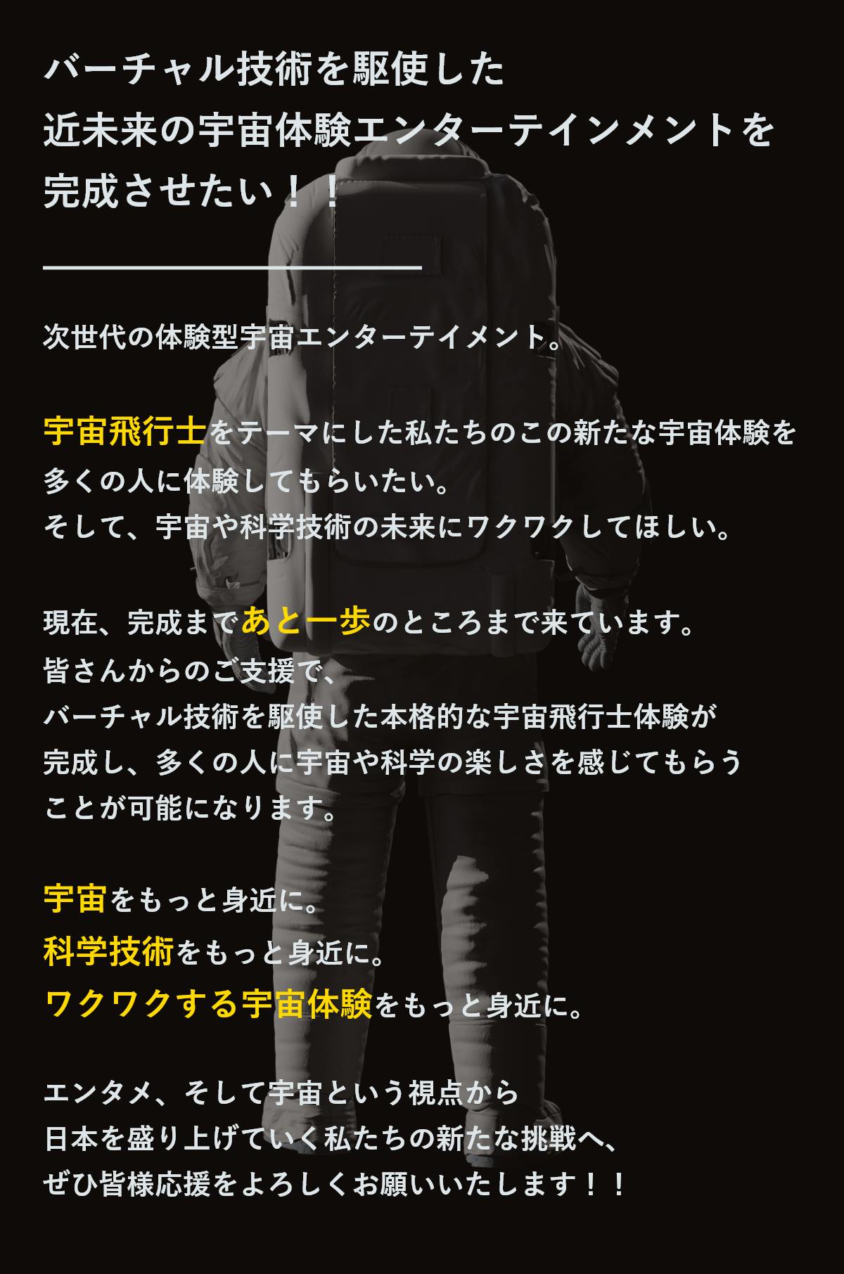 今回のクラウドファンディングを成功させることで、これら2つのバーチャル宇宙飛行士体験を日本中の皆様に体験していただくことが可能になります。
