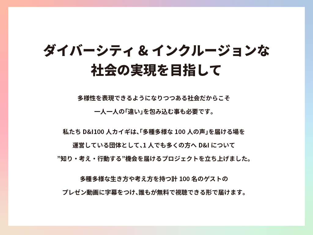 「D&I 100人カイギ」は、多様性が認められる社会をポジティブなものへと変化させる事が目標です。