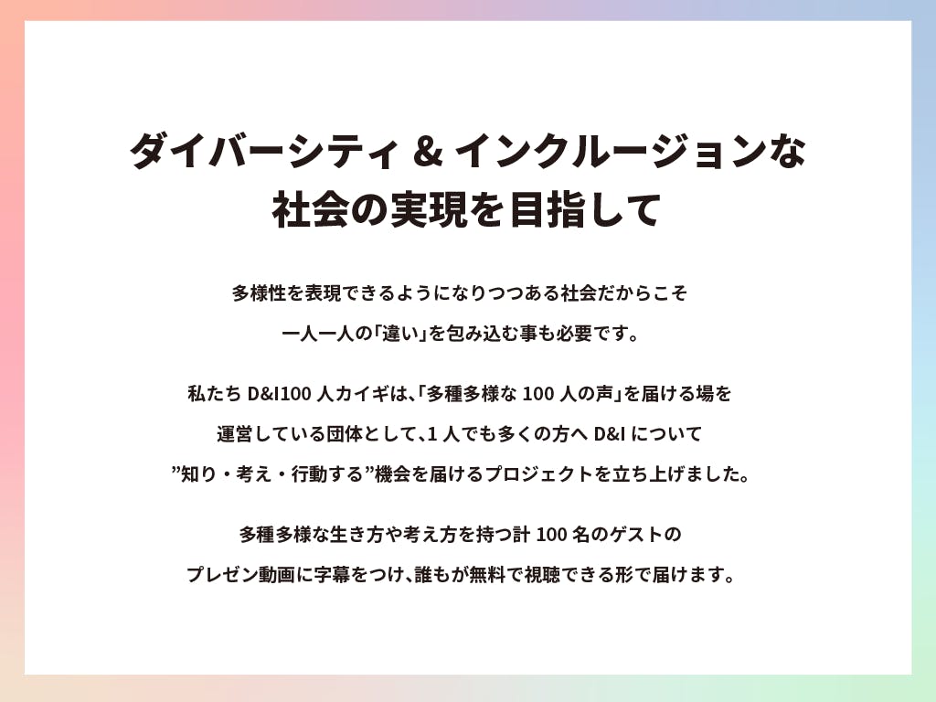 多様性が広まりつつある一方、理解のない言葉や無意識の偏見から「生きづらさ」を抱えている人も存在しています。私たちは「多様な100人の声」を届けることによって、D&Iの考え方や自分の無意識バイアスについて知るきっかけをつくり、誰一人取り残さないダイバーシティ&インクルージョンな社会の実現を目指します!