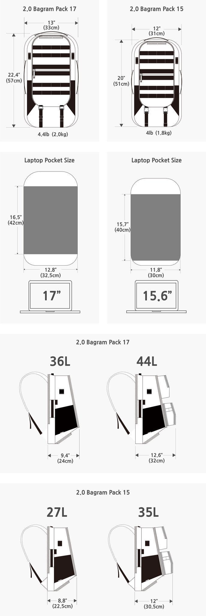 Bagram Pack15または17(本体)、シューケース、パットハンドル、バックルストラップ×2本、レインカバー、モジュラーベルト2.0、パッキング&ランドリーポーチセット、TSAロック、L Pouch 2.0、RFID BP Pouch 2.0、i Pouch 2.0 、S Pouch 2.0×2個