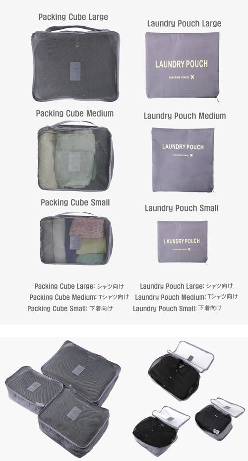 バラバラになりがちな衣類をまとめられるパッキングキューブとランドリーポーチです。