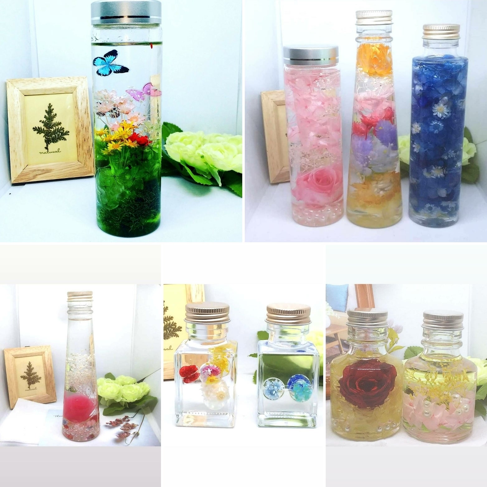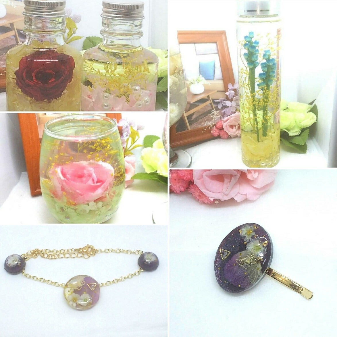 全ての商品にプリザーブドフラワーなどのお花が入っています。