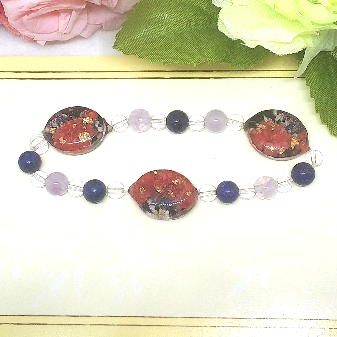 レジン部分はブレスレットとネックレスをペアになるようにデザインしました。ちょっと解りづらいですが、光を当てるとバックは黒と紫のツートンカラーになっています。