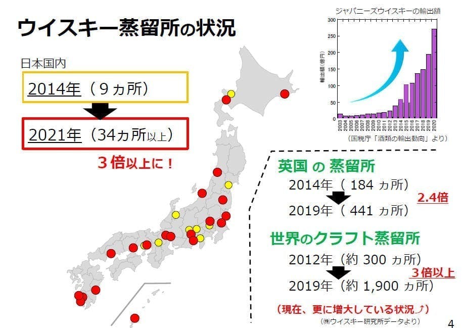 それに伴い、2014年には9箇所しかなかったウイスキー蒸留所は、2021年現在34箇所を越えて、近い将来40箇所を越えることが見込まれています。そして2020年にはジャパニーズウイスキーが日本酒を抜いて日本産酒類の輸出金額の一位となりました。これは海外市場において、ウイスキーが日本を代表する酒類のひとつとなったといえます。