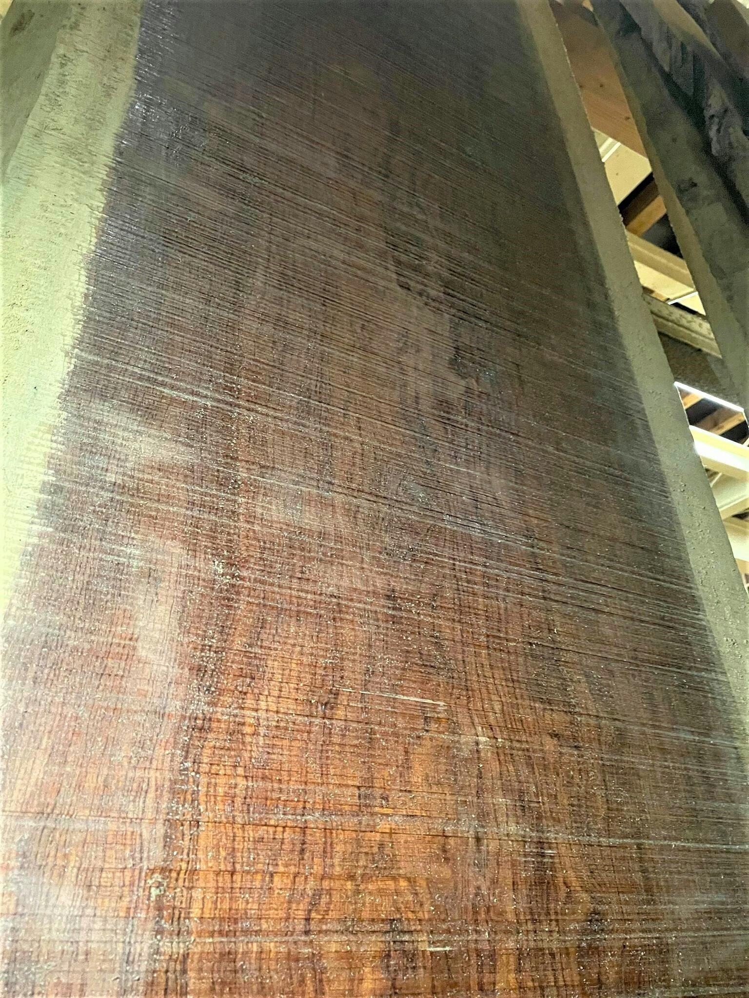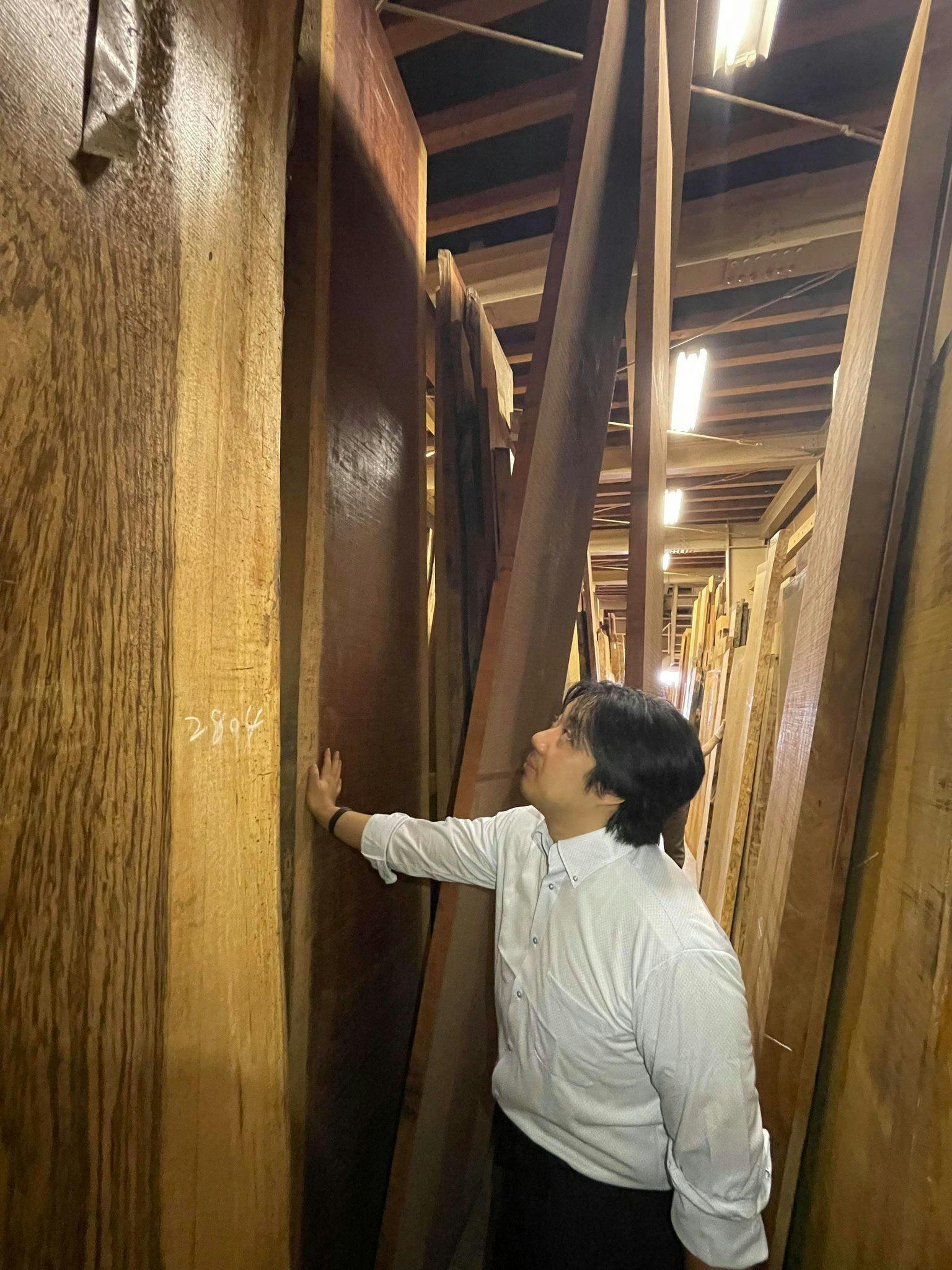 この一枚板は、私が下の写真で手を置いている長さ約4m、幅約70cmある一枚板のブビンガです。
