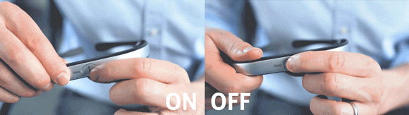 パワーボタンでON/OFFの切り替え。製品中央のスイッチを押すたびに、電源が緑(ON)または赤(OFF)になります。ライトが5回点滅した後に電源が入り、それから30分後に自動的にオフになる仕組みです。