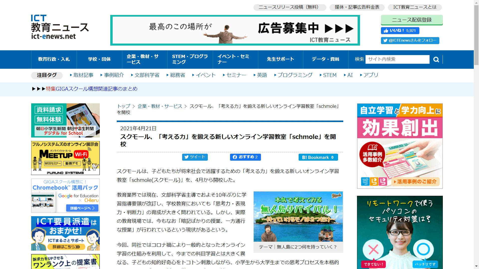 2021/04/26 17:06■スクモールのメディア掲載のお知らせオンライン学習教室「スクモール」が、このたび複数のWEBニュースメディアに掲載されました。以下、その掲載先とURLです (4/26時点)。ぜひ一度ご覧ください!【ICT教育ニュース】スクモール、「考える力」を鍛える新しいオンライン学習教室「schmole」を開校https://ict-enews.net/2021/04/21schmole/【exiteニュース】思考プロセスをトレーニングする新しい子ども教育 ~オンライン学習教室「スクモール」開校のお知らせ~https://www.excite.co.jp/news/article/Atpress_255786/【産経デジタル】https://www.sanspo.com/smp/geino/news/20210419/prl21041911020057-s.html【楽天Infoseekニュース】https://news.infoseek.co.jp/article/atpress_255786/この背景には、コロナ禍など変化の激しい時代において、子どもたちへの教育に対する高い関心が伺えます。将来の社会がどんな状況にあろうとも、あらゆる社会の困難に立ち向かうためには、暗記学習ではなく、子どもたちが自分の頭で考えて臨機応変に対応できる思考力こそが必要です。そのためにも、スクモールはその教育課題に正面から向き合い、将来を担う小学生・中学生・高校生・大学生の考える力をトコトン鍛える授業をこれからも展開して参ります。引き続きご支援のほど何卒よろしくお願い申し上げます!■LINE公式アカウント開設のお知らせスクモールのLINE公式アカウントを開設しました!LINEお友だち限定の動画や、最新情報、キャラクターのモルモルのつぶやきなど、楽しく役立つ情報が盛りだくさんです。【お友だち追加 方法】■URLから追加https://lin.ee/kGwi5fR■QRコード読み取り (画像)■ ID検索LINE「友だち追加」メニューからID『@755cdxej』で検索ぜひお友だち登録をよろしくお願いいたします!スクモール代表 岡崎、田中 もっと見る【支援者の皆さまへ】私立トレンド学園シリーズのURL