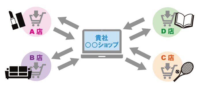 ネット上で実際の商品の移動を伴わずに、他店の商品を貴店ネットショップで販売してあげたり、他店ネットショップに貴店の商品を販売してもらったりが簡単に行えます。 貴店ネットショップで他店の商品が売れたときには販売手数料収益が得られ、逆に他店ネットショップ側で貴店の商品が売れたときにも販売収益が得られます。今ご利用中の貴店ネットショップをそのまま使って改造無く実現が可能です。カートもこれまで通り使えます。
