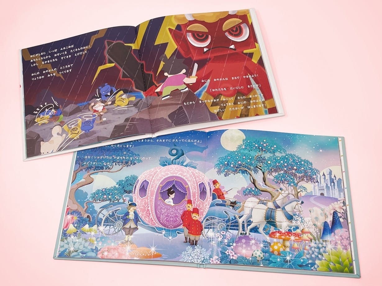 自分が絵本の主役となって絵本の世界に入ることができるオリジナル絵本です。名作絵本と最新テクノロジーを融合させることで、シンデレラや桃太郎など小さい頃に一度は憧れた“あの”世界に入ることができます。