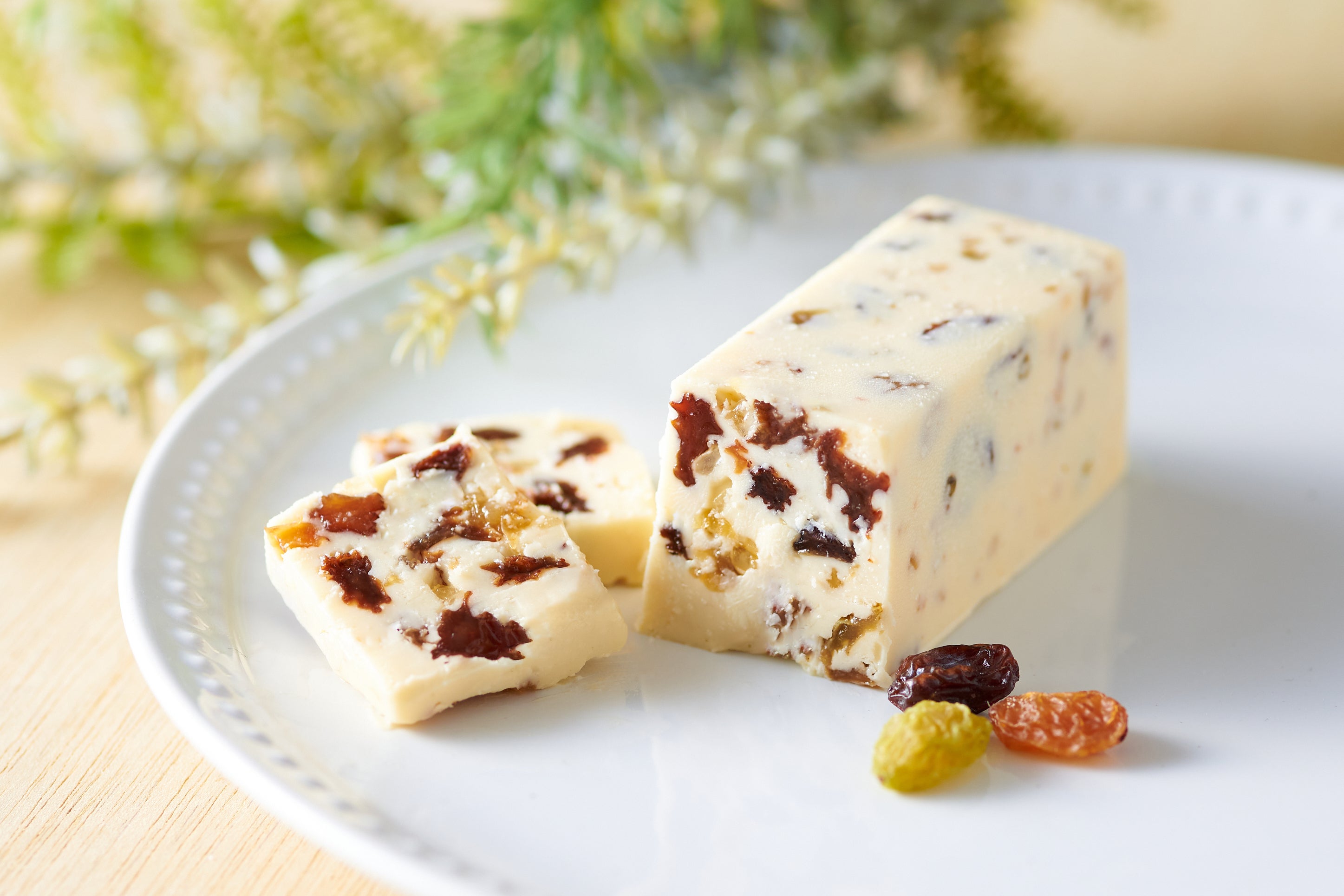 レーズンバターの見た目を決める大切な要素のひとつとして、一口サイズにカットした時に均等にフルーツが入るようにする必要があります。