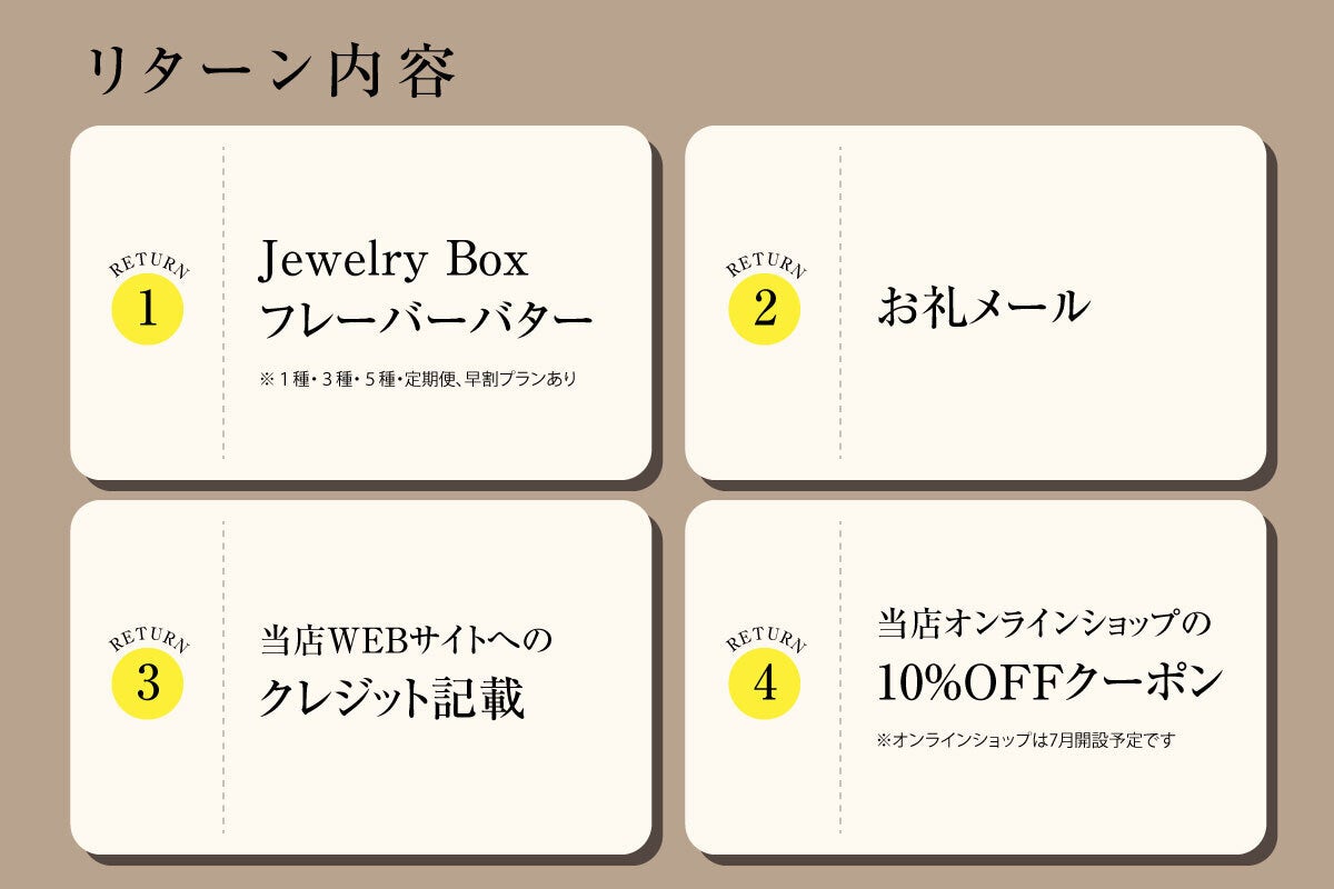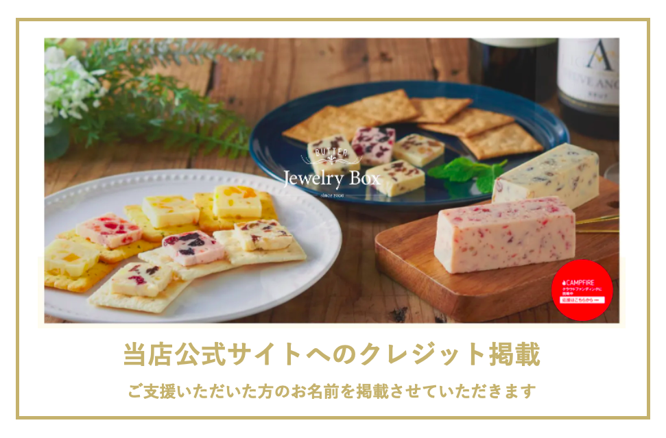 2021/06/28 10:18こんにちは。レーズンバター専門店Jewelry Boxです。この度はクラウドファンディングCAMPFIREにて、当店をご支援いただき誠にありがとうございました。ご支援から長らくお待たせ致しました。本日、ご支援くださったリターン品を発送したことをお知らせ致します。Jewelry Boxを皆様と一緒にスタートできることに幸せを感じております。気持ちを込めてつくったJewelry Boxのフレーバーバターをご賞味ください。なお、リターン品は『ご支援日の早い順』に順次発送いたします。発送の際はメールにてご案内させていただきます。※迷惑メールの対策などでドメイン指定を行っている場合、メールが受信できない場合がございます。「info@jewelry-box2020.com」を受信設定してください。それでは、リターン品の到着まで今しばらくお待ちください。 もっと見るご支援者様500名、ご支援額300万円の大台を達成できました!