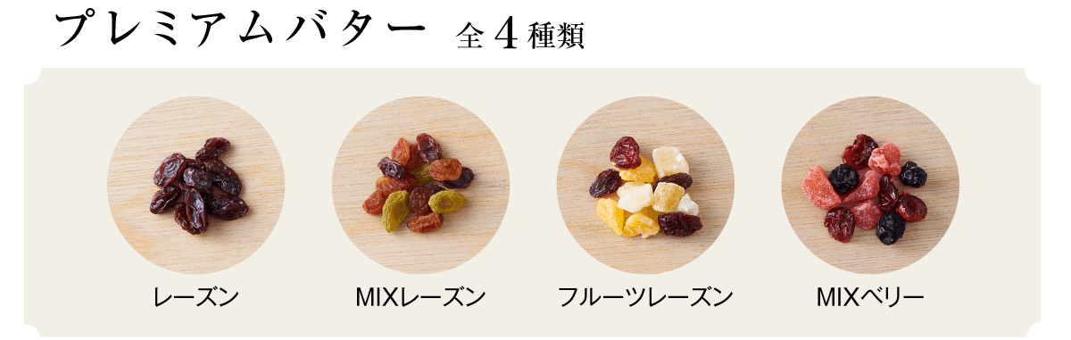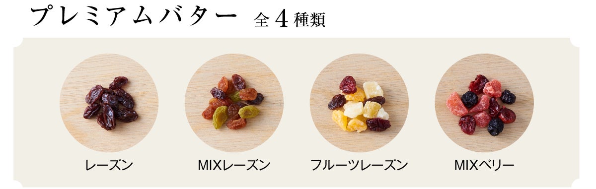 クリームチーズをブレンドし、口当たりなめらかでマイルドなバター感を楽しめる『リッチバターテイスト』。「練乳」「はちみつ」「ザラメ」など、それぞれのドライフルーツに合った甘味をセレクト。それぞれ異なるリキュールを厳選してブレンドしているのもポイントです。レーズンバターが苦手な方でも、スイーツ感覚でお召し上がりいただけるシリーズです。