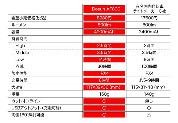 落下試験を実施しており、走行中の落下に対する耐久性が他のライトよりも優れています。