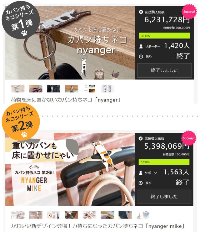 2024/07/31 09:45みなさん、こんにちは^^nyagnger プロジェクトが残り16時間を切りました!おかげさまで、目標値は大幅に達成することができました!改めて、ご支援いただいたみなさま、誠にありがとうございます。数に限りはございますが、お得にゲットできる最後のチャンスとなります!https://camp-fire.jp/mypage/projects「ご友人やご家族へのプレゼント」としてもご購入頂いたとのお声も多く頂いております。プレゼントに最適なオリジナルBOXもご用意しておりますので、ぜひ猫好きな方への贈り物としてもご検討ください^^https://camp-fire.jp/mypage/projectsまた、ライフスタイルを豊かにするためのアイテムを紹介している【lifehacker】というメディアにもnyangerの紹介記事が掲載されています!https://www.lifehacker.jp/article/236004-machi-ya-nyanger-review/ぜひご覧くださいませ。では、残り13日にはなりますが、引き続きよろしくお願いいたします!ーーーーーーーーーーーーーーーーーーーーーーーーーーーーーーーーーーーーーーーー【nyanger PR動画】https://www.youtube.com/watch?v=YXcOM-co12Q【instagram「nyanger_」】https://www.instagram.com/nyanger_/ーーーーーーーーーーーーーーーーーーーーーーーーーーーーーーーーーーーーーーー もっと見る